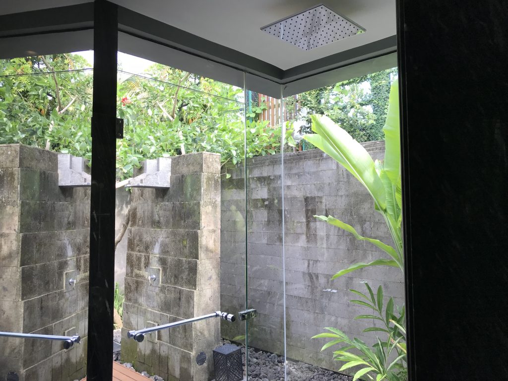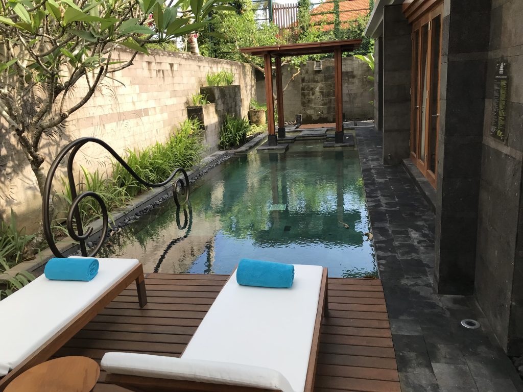 Nach dem Betreten des Villabereiches stand man direkt in dem kleinen Garten der Pool Villa, in dem sich ein großzügiger Pool mit zwei Liegen befand. Hinter dem Pool befanden sich direkt im Anschluss ein Whirlpool und eine Außendusche.