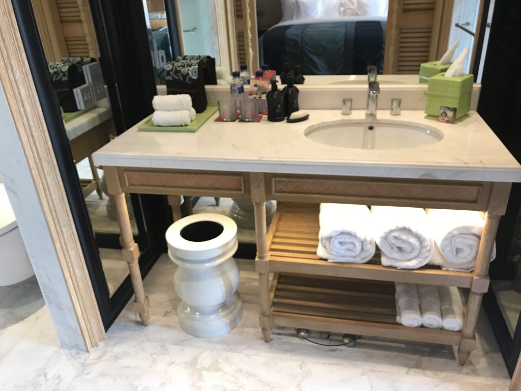 In der Mitte des Bades stand ein großer Waschtisch, mit allerlei Amenities und einem großen Spiegel.