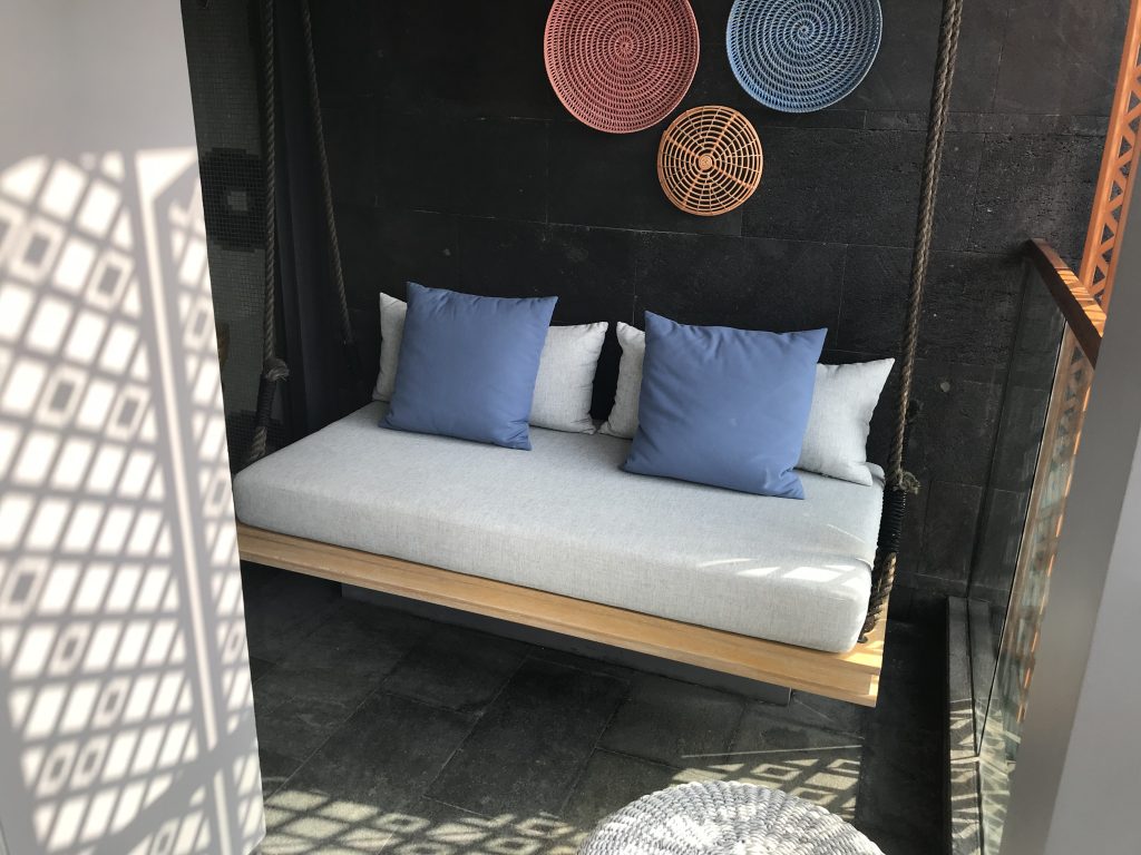 Vom Schlaf-/Wohnbereich aus gelangte man auch auf den großzügigen Balkon. Auf dem Balkonbefand sich eine große, gemütliche Hängecouch. Man hatte einen fantastischen Blick über das begrünte Gelände des Hotels.