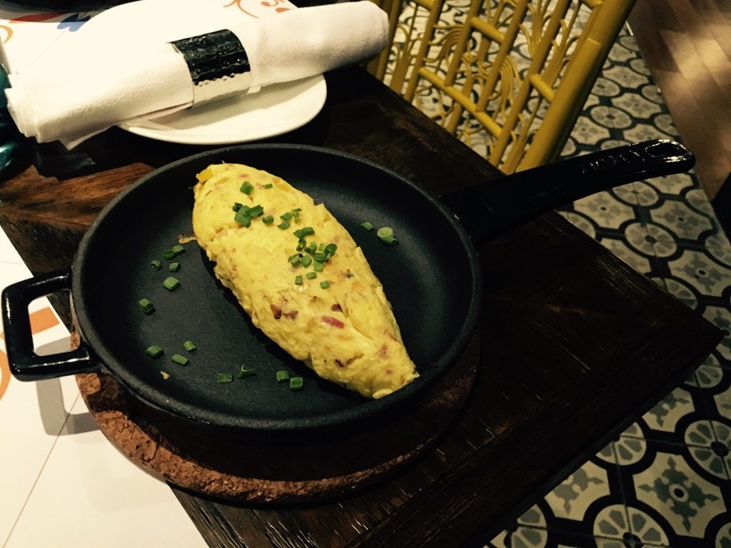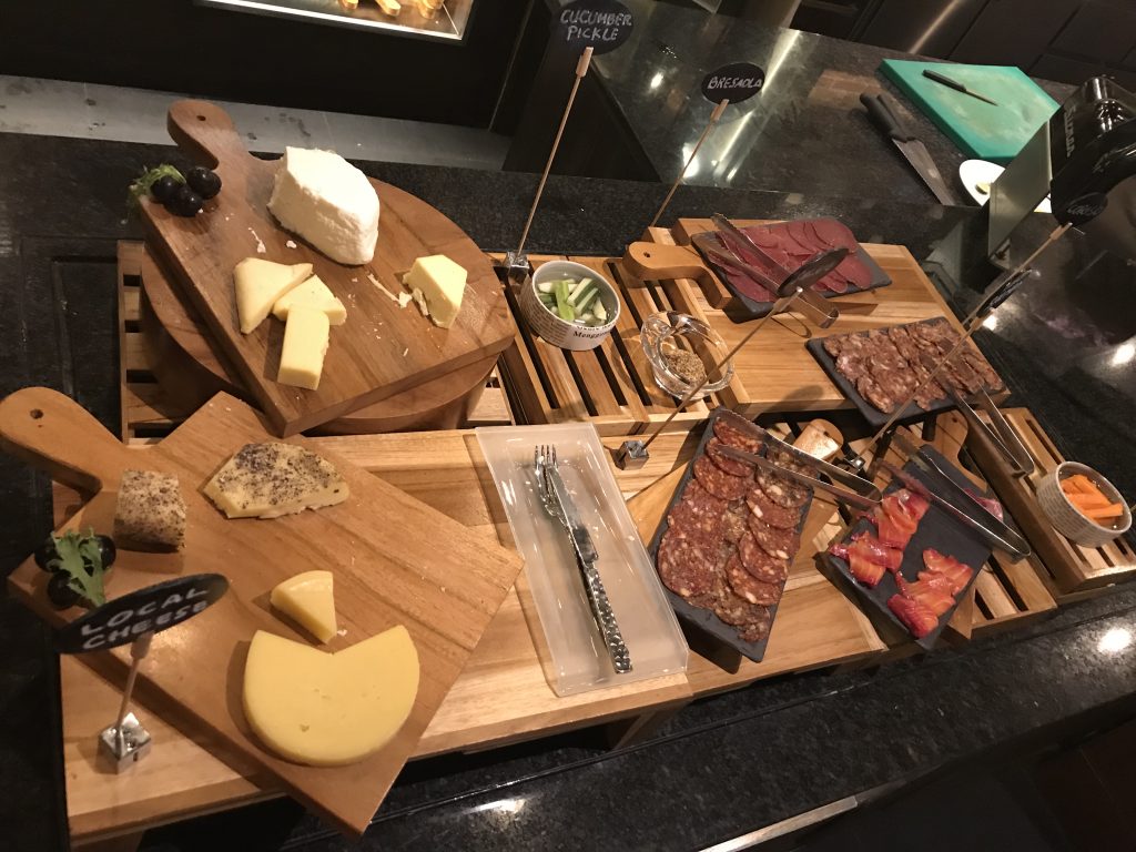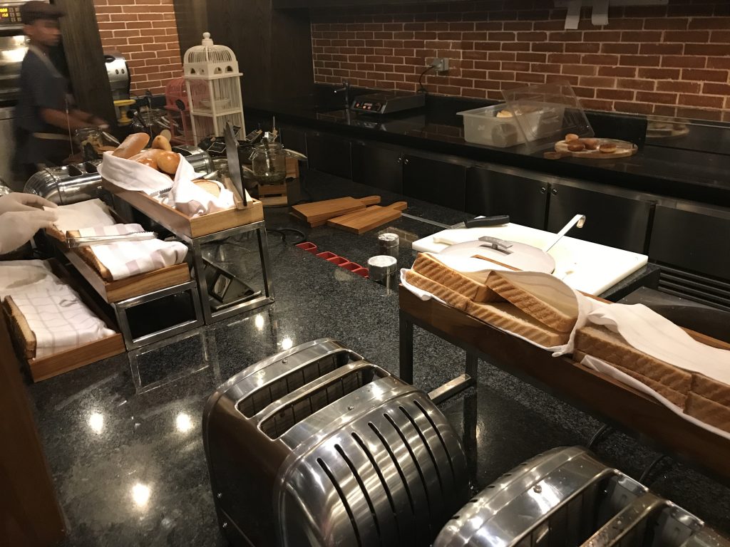 Auf dem Buffet waren neben Backwaren, Aufschnitten, Marmeladen und süßen Aufstrichen, Obst, warmen Gerichten und den üblichen Dingen noch eine Eier- und eine Waffelstation. An diesen Stationen wurden Eierspeisen, Waffeln und Pancakes auf Wunsch zubereitet und ebenfalls an den Platz gebracht.