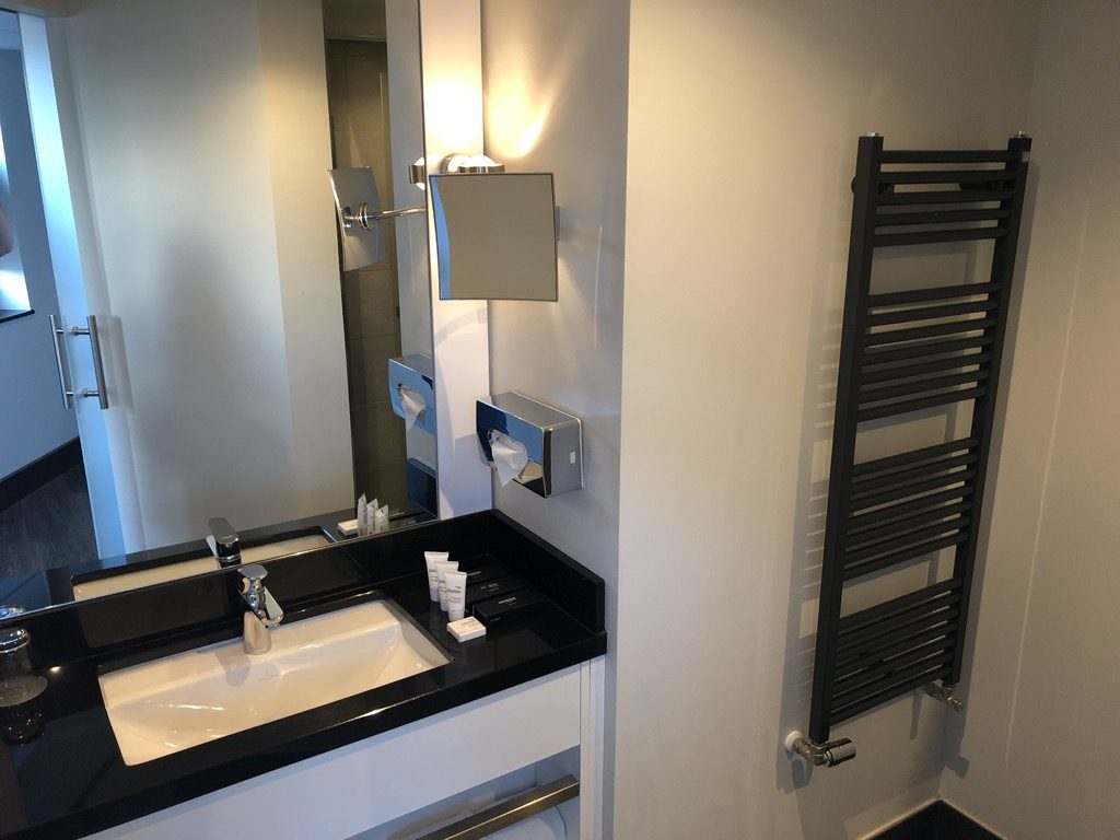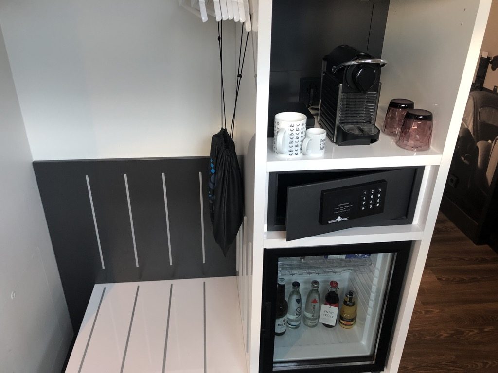 Das Badezimmer verfügte über eine großräumige Dusche – inklusive Regendusche. Dazu gab es ein extra abgetrenntes kleines Zimmer mit der Toilette. Zudem wurden neben der Minibar auch eine Nespresso-Maschine sowie Bademäntel und einige weitere Amenities angeboten.