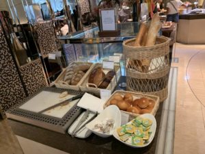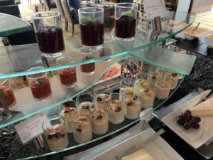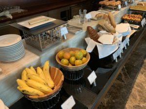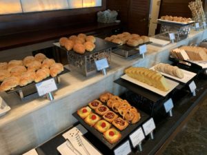 Das Frühstück im Club InterContinental wird in einem, für Club Lounges ungewöhnlich großen Bereich aufgebaut. Dafür wird die komplette Bar sowie Tische an den beiden Seiten des Raumes genutzt. Ergänzt wird das Frühstücks-Büffet noch um eine zusätzlich große Insel inmitten der Fläche.