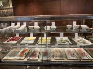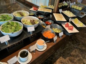 Daher könnt Ihr sicher erahnen, dass die Auswahl auch sehr umfangreich ist. Natürlich gibt es Brot, Toast und süßes Gebäck in diversen Varianten. Salami, Schinken, Käse und Fisch standen als Aufschnitt zur Verfügung. Natürlich konnten wir auch aus diversen Sorten Cerealien und Müsli wählen. An einem eigenen Bereich konnten wir uns frischen Salat und Obst zusammenstellen, während an der zentralen Insel kleinere Snacks, wie z. B. Bircher Müsli, Fruchtsalat und Kompott darauf warteten, verspeist zu werden. Alles sehr hochwertig ausgewählt und hübsch präsentiert..