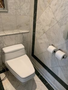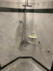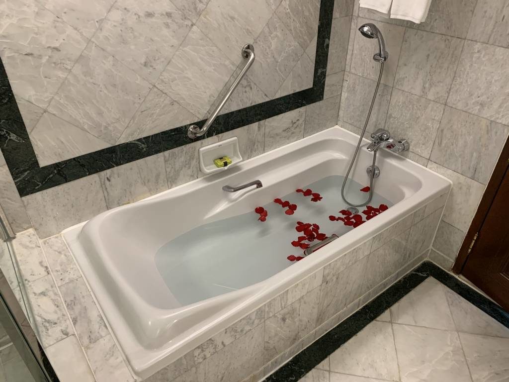 Das Badezimmer verfügt über eine separate Dusche, sowohl mit Hand-Duschkopf und fest installierter Regendusche, und eine große Badewanne. In die Badewanne war bei Ankunft ein Schaumbad eingelassen, welches mit Rosen dekoriert war. Spätestens jetzt war uns klar, dass aus der angekündigten Babymoon- eine Honeymoon-Reise geworden war. Nicht schlimm, denn während der Reise feierten wir ja auch unseren zweiten Hochzeitstag. Das Marmor-Badezimmer wird noch durch einen großen Waschtisch und das WC vervollständigt.