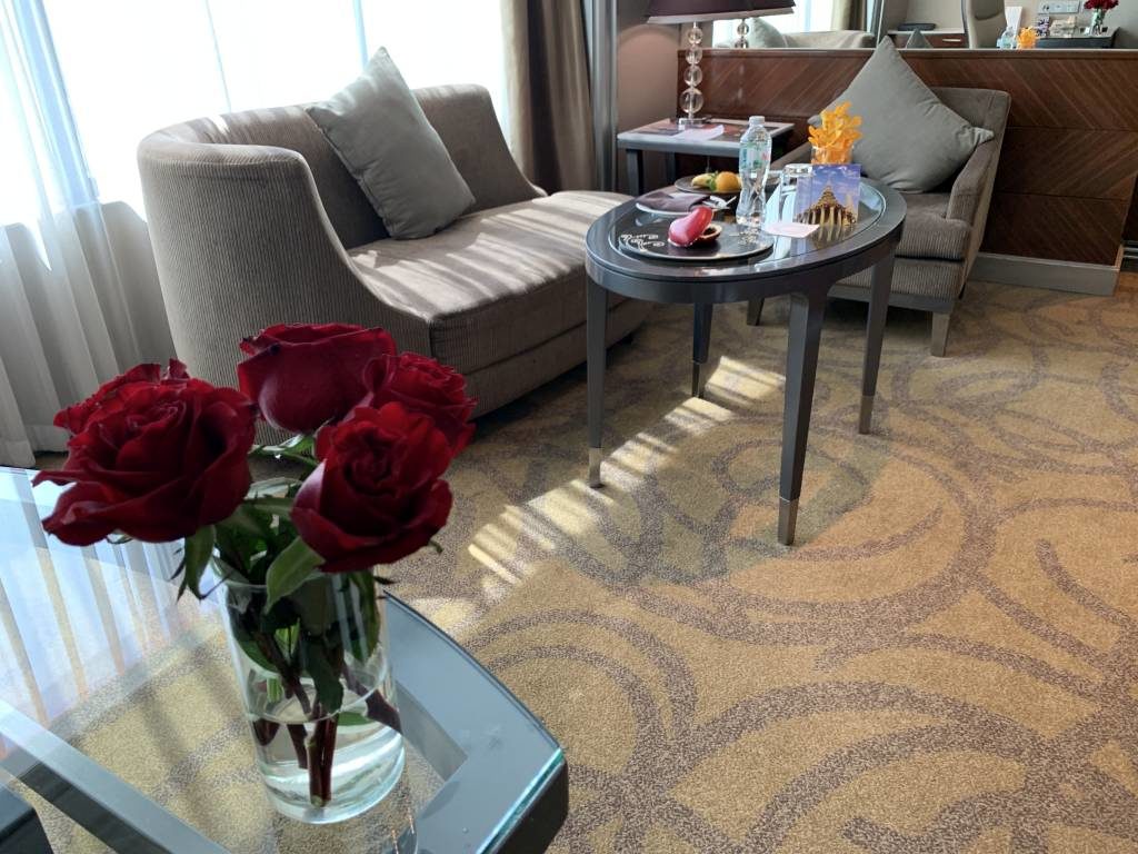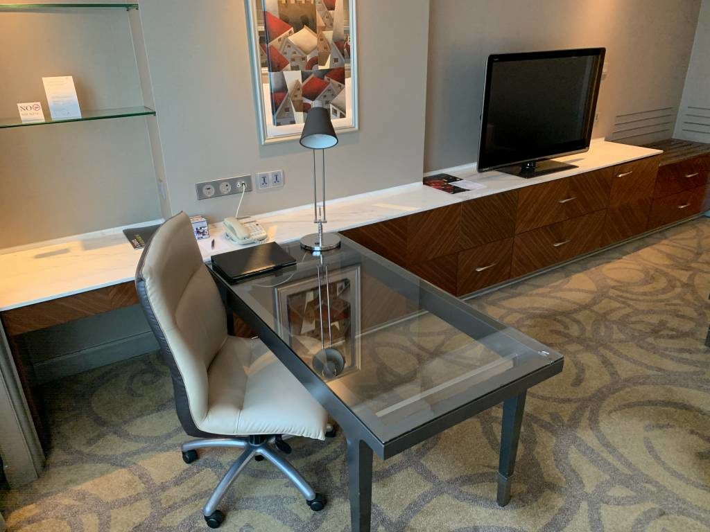 Beim Betreten der Corner Suite gelangten wir zunächst in den Wohnbereich. Direkt Richtung Eingangsbereich gerichtet, gibt es einen großer Schreibtisch. Darin liegen auch alle wichtigen Hotel-Informationen. Im zentralen Teil des Wohnbereichs befindet sich eine gemütliche Sitzgruppe mit einem Couchtisch und gegenüber ein erster Flachbildfernseher. Auf dem Tisch wartete zur Begrüßung ein kleines Willkommensgeschenk auf uns. Unter anderem ein Herz aus Schokolade. Für den gemütlichen Fernsehabend mit einem Bierchen und ein paar Nüssen, gibt es hier im Raum ebenfalls die (deutlich überteuerte) Minibar.