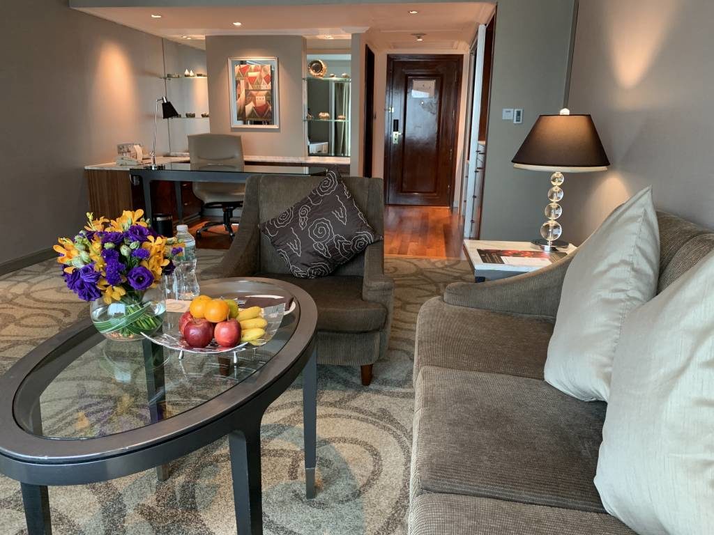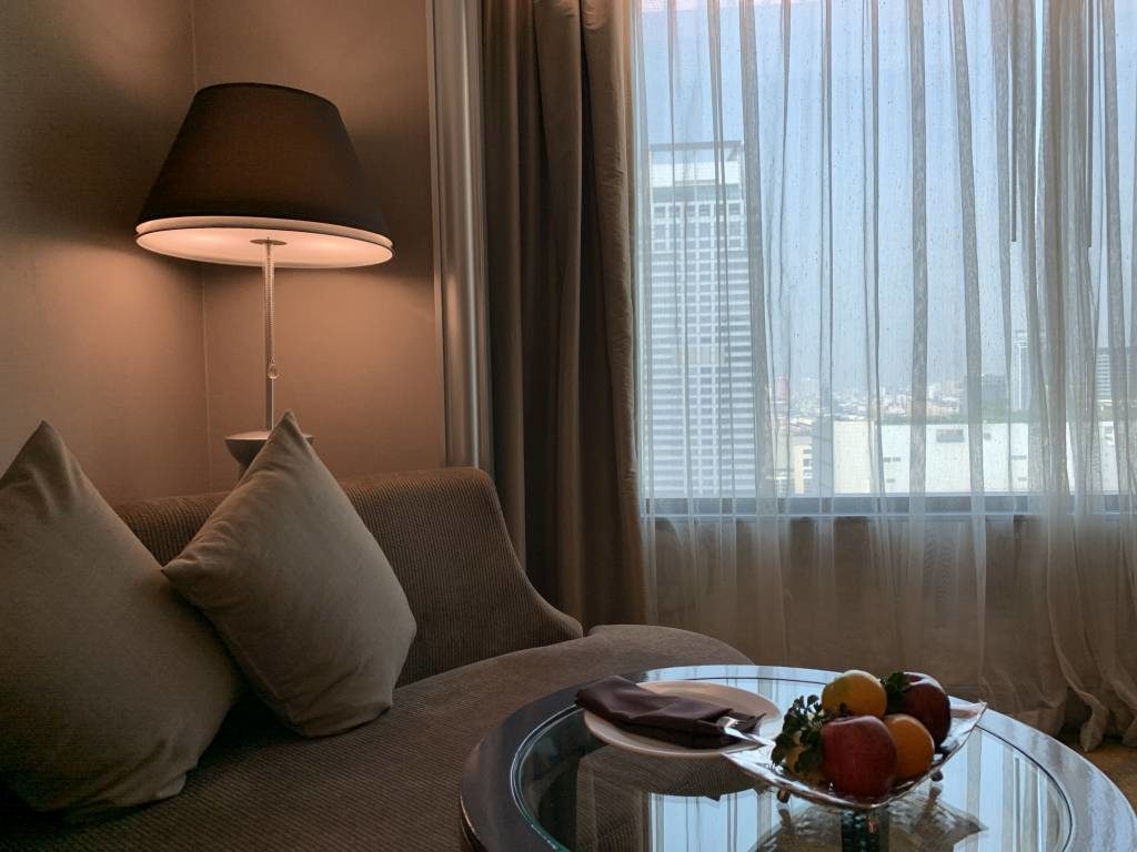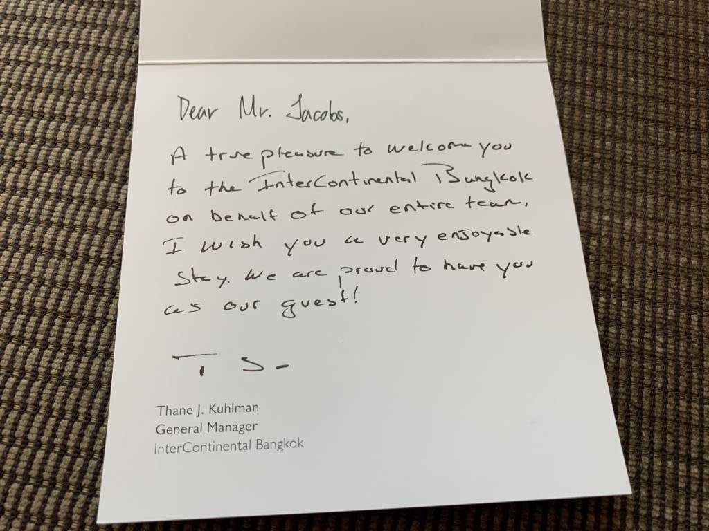Wir sind mit einem IHG Rewards Club Spire Elite und dem InterContinental Ambassador Status im InterContinental Bangkok angereist. Während der IHG Status in der Regel bei InterContinental Hotels wenig bringt, bekamen wir durch den Ambassador Status ein Upgrade auf eine Corner Suite. Außerdem lag als nette Geste bei unserer Ankunft ein handgeschriebener Welcome-Letter auf unserem Zimmer.