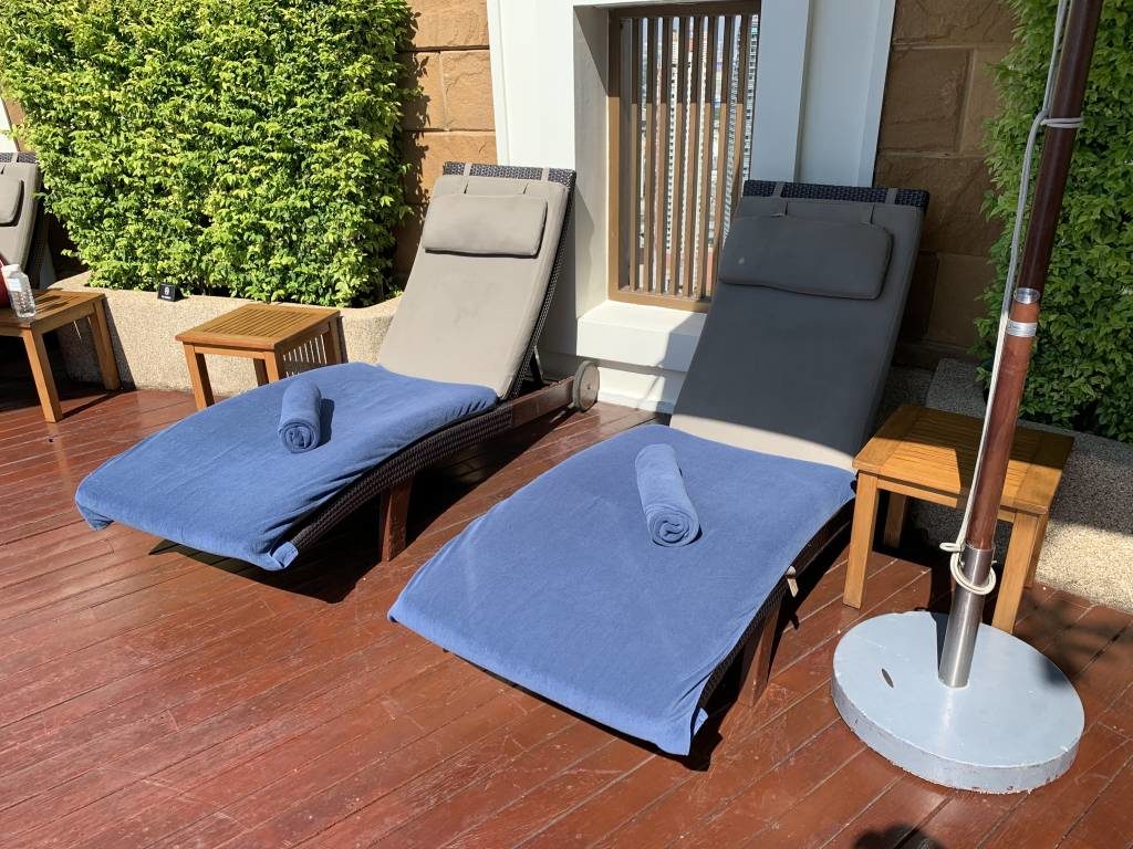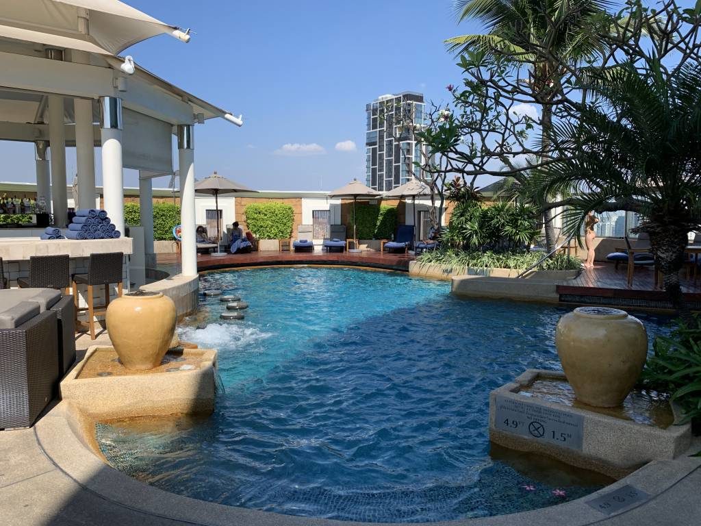 Auf der 37. und damit höchsten Etage des InterContinental Bangkok befindet sich der „Oasis“ genannte Outdoor Pool. Wirklich eine Oase der Ruhe, denn der Pool hat eine überschaubare Größe und war trotzdem zu keinem Zeitpunkt unseres Aufenthalts überfüllt. Durch die zahlreichen Grünpflanzen und den teilweise verlegten Holzboden vergaßen wir schnell, dass wir uns mitten im geschäftigen Bangkok befinden.