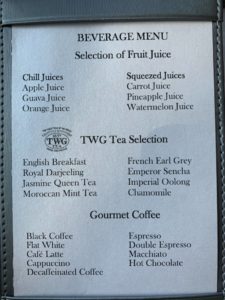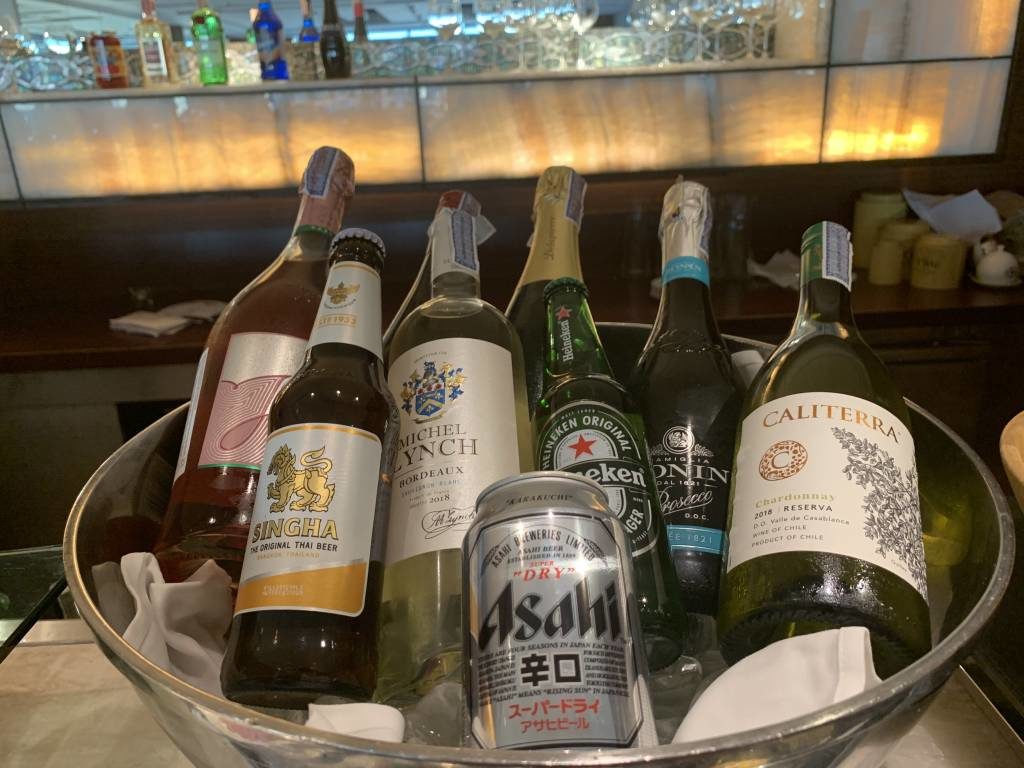 Alkoholische Getränke werden durchgehend und sehr aufmerksam am Tisch serviert. In der Karte fanden sich diverse Weiß- und Rotweine, Biere (Heineken, Asahi und Singha), mittelpreisige Spirituosen (z.B. Tanqueray Gin, Chivas Regal und Olmeca Tequila), Cocktails (z.B. Singapore Sling, Mojito, Long Island Ice Tea) und Sparkling Wine (Prosecco, Cava und ein Rose)… Stop! Halt! Sparkling Wine!? Hier wurde unsere Guest-Experience dann leider einen Moment (oder auch zwei Abende) lang etwas befremdlich…
