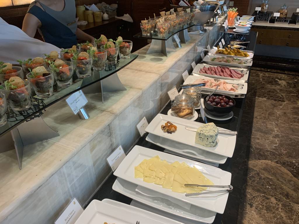 Das Frühstück im Club InterContinental wird in einem, für Club Lounges ungewöhnlich großen Bereich aufgebaut. Dafür wird die komplette Bar sowie Tische an den beiden Seiten des Raumes genutzt. Ergänzt wird das Frühstücks-Büffet noch um eine zusätzlich große Insel inmitten der Fläche.