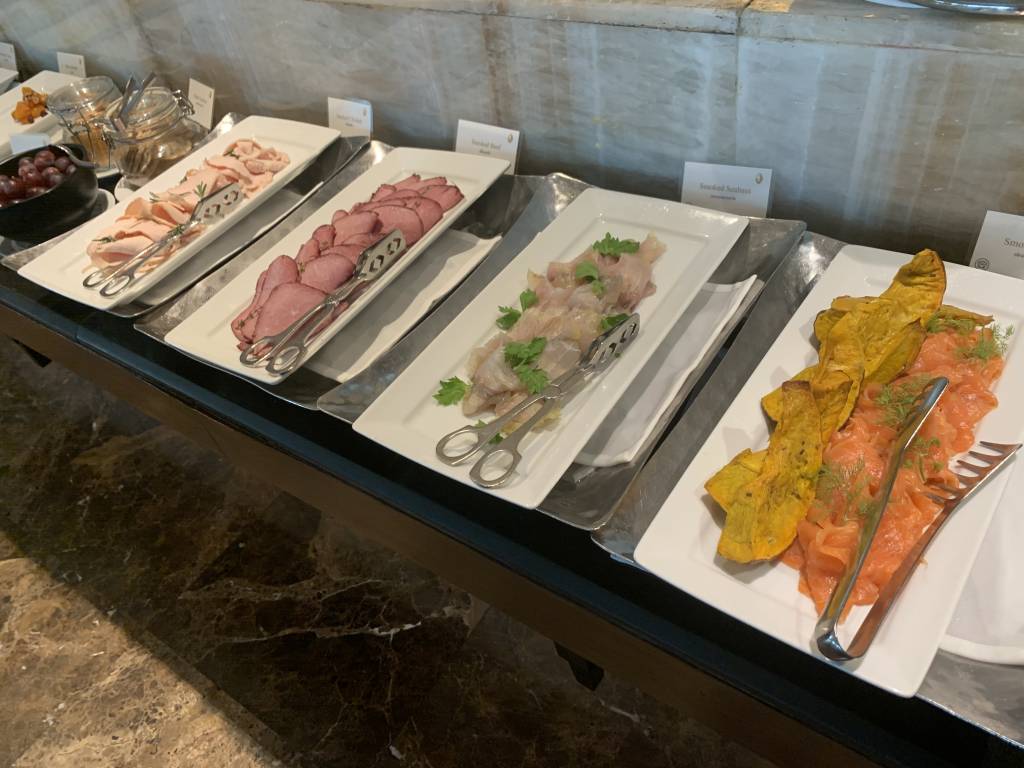 Das Konzept des Club InterContinental in Bangkok erinnerte mich sehr stark an das InterContinental Hua Hin. Von 14:30 bis 16:30 Uhr gibt es einen Afternoon-Tea, der als Set am Tisch serviert wird. Etwas später von 17:30 bis 19:30 Uhr gibt es alkoholische Getränke und ein Büffet, ergänzt von warmen Canapees, die ebenfalls am Tisch serviert werden. Selbst die Last-Order um 19:15 Uhr ist identisch.