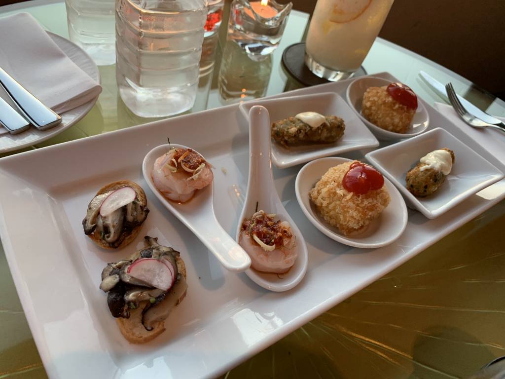 Im Bereich der Bar wurden zum Evening Cocktail diverse kalte Speisen aufgebaut. Täglich gab es mehrere Sorten Sushi, alle Zutaten für einen Cesars Salad, Antipasti und wechselnd kleine Snacks. Auf der zentralen Insel wurde jeden Abend ein Dessert-Büffet mit einigen schmackhaften Köstlichkeiten aufgebaut. Ergänzend wurde uns jeden Abend am Tisch eine Auswahl an warmen Canapees vorgestellt. Während das hier aufgezählt wurde, hat das Team in Hua Hin dies etwas besser gelöst, denn dort führte man die unterschiedlichen Snack am Tisch vor.