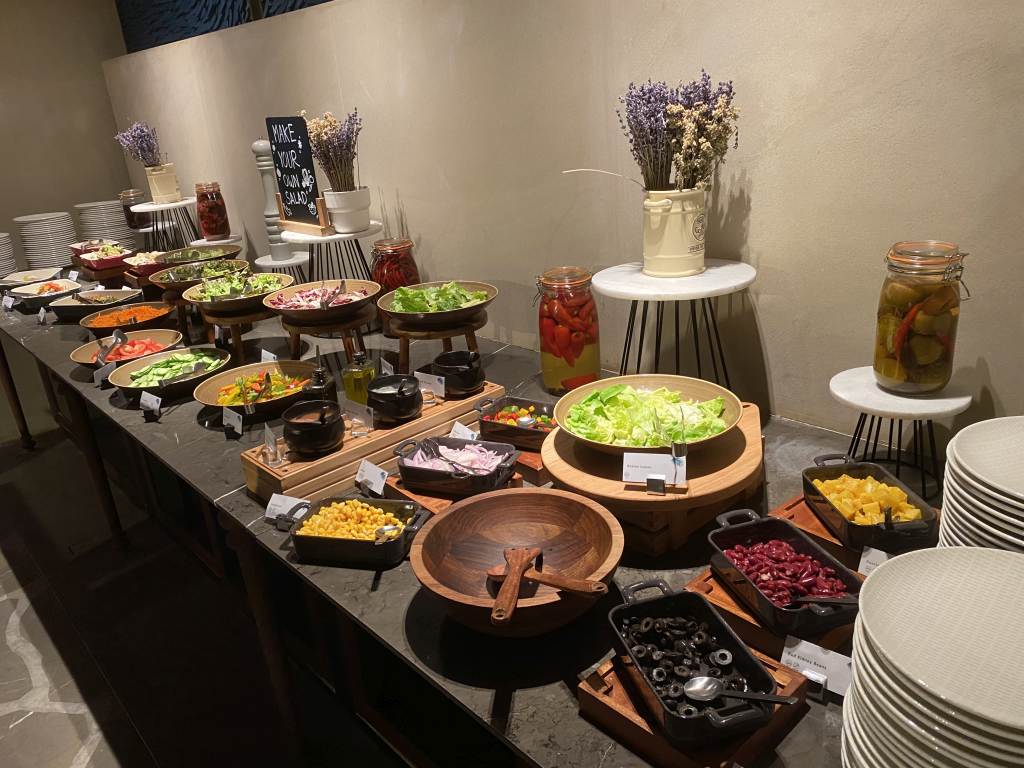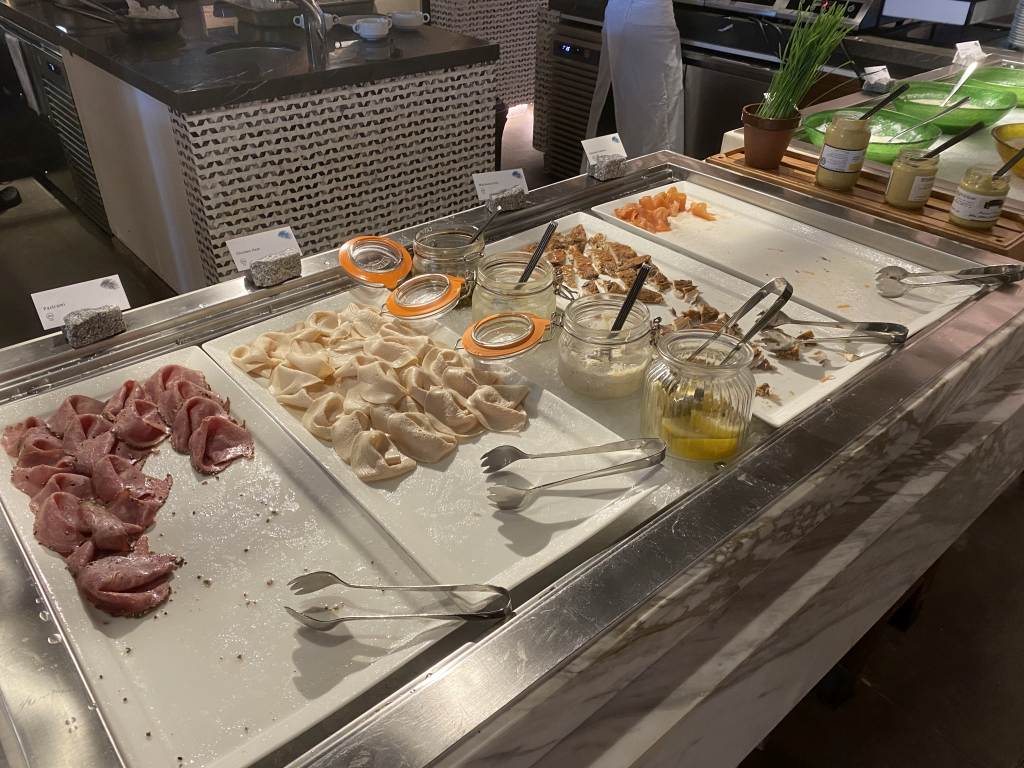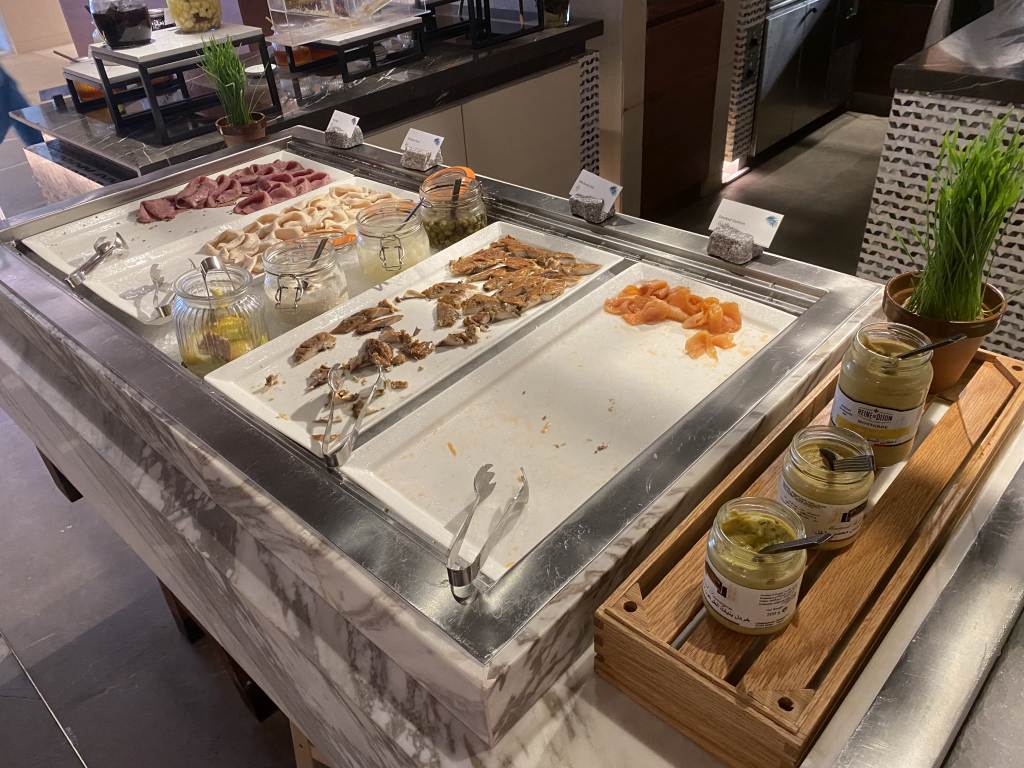 Besonders herausstechend ist dabei die arabische Sektion mit zahlreichen Optionen, um sich eine Mezze Platte nach Wunsch zusammen zu stellen. Doch auch die Eierstation weiß zu begeistert. Die Frage nach den Eggs Benedict muss allerdings nicht gestellt werden. Das befindet sich direkt daneben bereits fertigt zubereitet. Nicht nur Eier gibt es als warme Optionen. Zahlreiche andere Gerichte sorgen ebenfalls für Abwechslung. Genauso wie der Aufschnitt aus hochwertiger Wurst, diversen Käsesorten und natürlich Fisch.