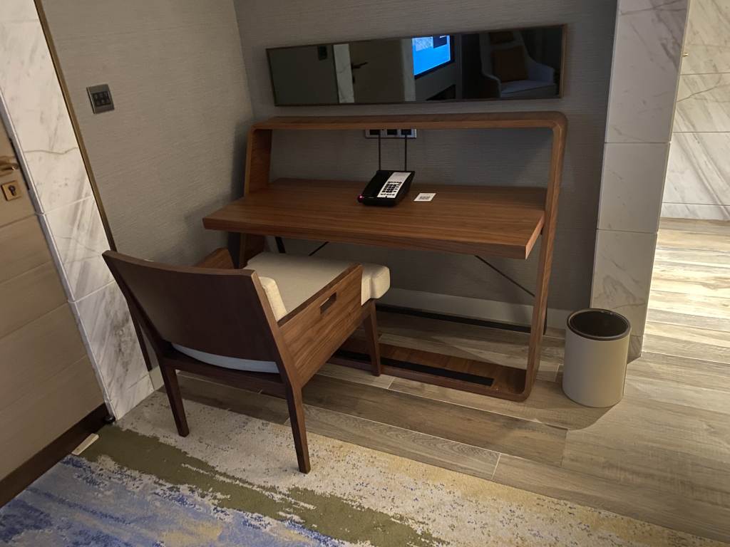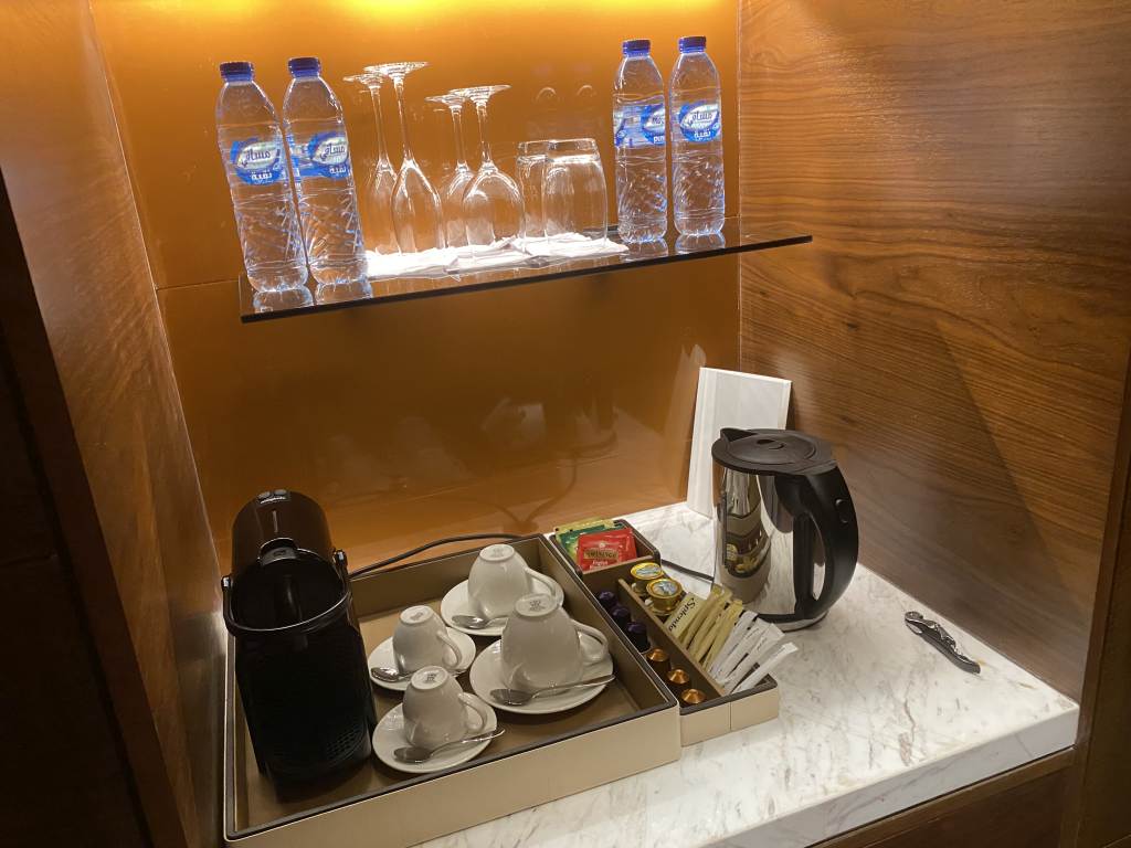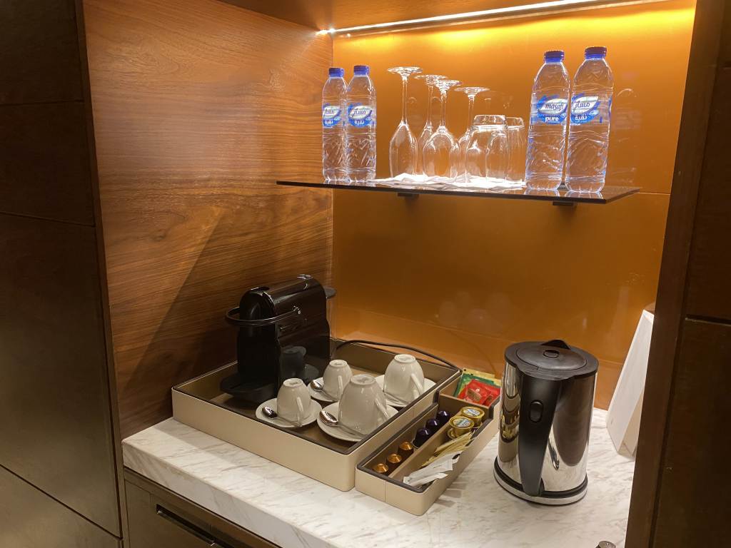 Wie üblich betritt man die Suite durch einen Gang, in dem rechter Hand schon Kaffee-Kapselmaschine, Wasserkocher, Trinkwasser in Flaschen und diverse Gläser bereit stehen. Daran anschließend erreichen Gäste den Wohn- und Arbeitsbereich. Während in einer Ecke ein Schreibtisch Raum für die weniger entspannenden Stunden des Aufenthalts bietet, dominiert im Wohnbereich das bequeme und riesige Sofa mit einem ebenfalls sehr großzügigen Couchtisch. Auf der gegenüberliegenden Seite befindet sich natürlich ein großer Flachbildfernseher und ein zusätzlicher Lesesessel mit stimmungsvoller Leselampe. Die Familie genoss es, sich in diesem Sessel im Kreis zu drehen (auch schon vor dem ersten Drink).