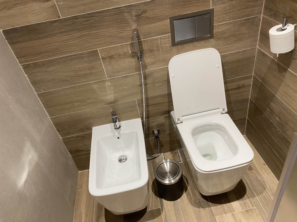 Das eigentliche Badezimmer verfügt über eine abgetrennte Toilette, eine halb freistehende Badewanne, eine große Dusche und zwei Waschtische.