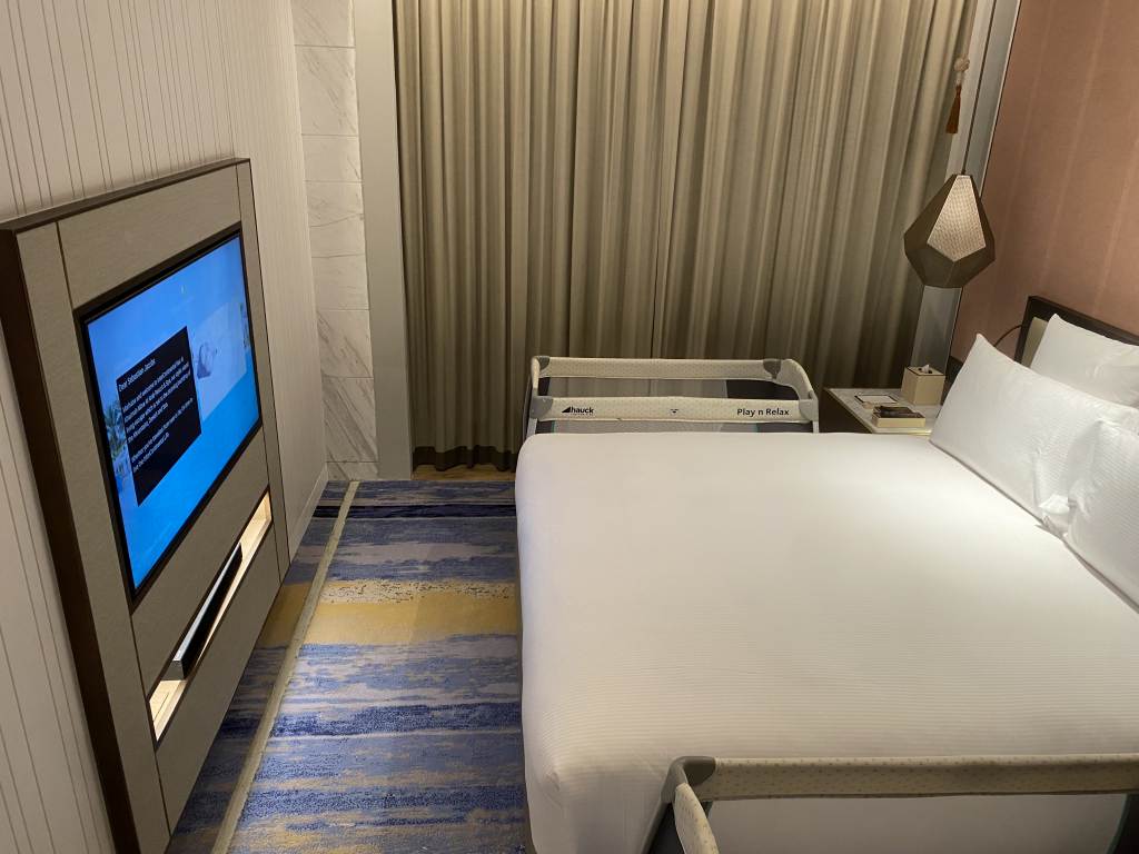 Aber setzen wir unsere Zimmertour fort. Das Schlafzimmer ist der zweite Raum der Suite. Während vom Wohnbereich auch der Balkon betreten werden kann, hat der Schlafbereich nur ein Fenster. Im Zimmer finden das große Kingsize-Bett Platz. Kommen noch zwei Babybetten dazu, wird es dann schon eng. Auch hier findet Ihr natürlich einen weiteren Flachbild-TV an der Wand.