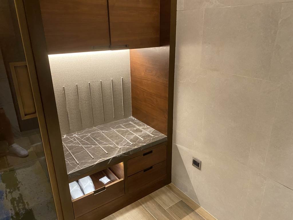 Vom Wohnzimmer öffnen sich Türen zum Schlafzimmer und Badezimmer. Sie schließen sich auch wieder, wenn man nicht mit einem eher weniger luxuriösen Keil die Türen fixiert. Und das ist vermutlich auch ein gutes Beispiel für den Zustand der Räume: Es wurde extrem viel Wert auf Luxus und qualitativ hochwertige Materialen gelegt. Verarbeitet wurden diese Materialien jedoch eher weniger qualitativ hochwertig. Schaut man sich beispielsweise die Verfugung in den Badezimmern an, bekommt man den Anschein, dass es hier entweder schnell, schnell, schnell gehen musste oder im mittleren Osten einfach so gebaut wird.