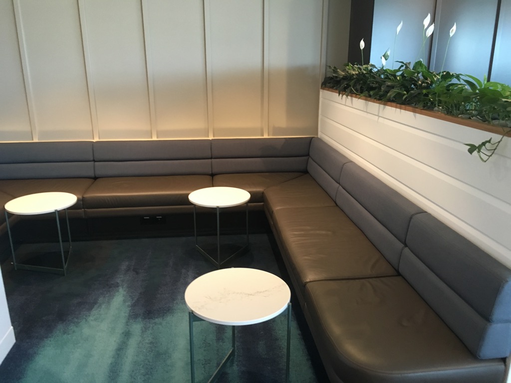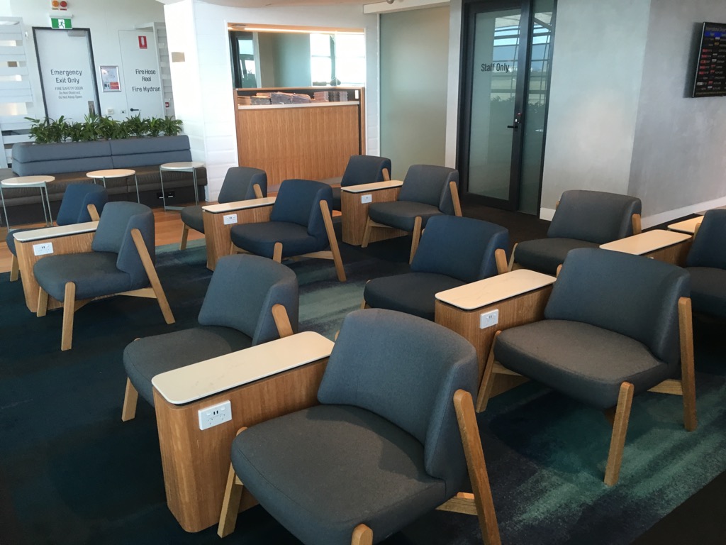 Entlang der großen Fensterfront hin zum Terminal befindet sich der eigentliche Loungebereich mit vielen Sesseln und Bänken in verschiedenen Sitzgruppen. Durch die aufgelockerte Anordnung wirkte die Lounge nie besonders voll. Extrem positiv sind mir die vielen Steckdosen an allen Sitzplätzen aufgefallen. Allerdings gibt es hier „nur“ australische Steckdosen und keine internationalen Steckdosen, wie man es z.B. im Flugzeug hat.