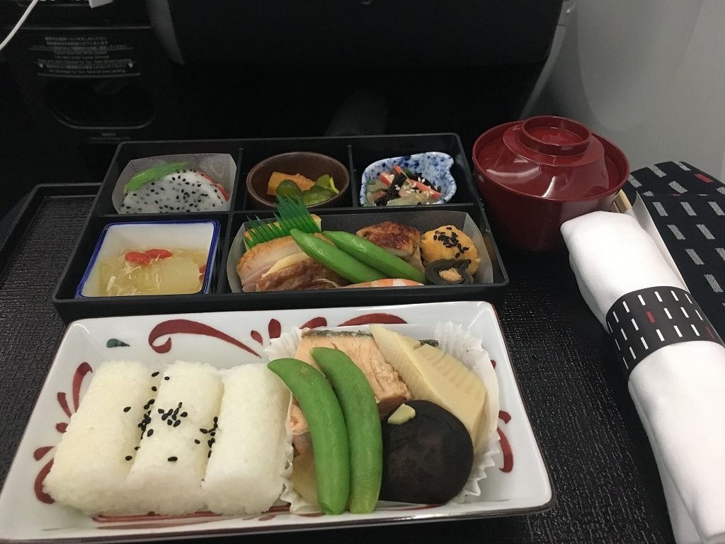 JAL hat den Ruf, sehr gutes Essen zu servieren, was ich nur bestätigen kann. Das Essen wird von exzellenten Köchen entworfen. Auf der Homepage kann man meist schon Monate im Voraus lesen, was es auf dem Flug zu essen und zu trinken geben wird. Besonders schön ist, dass man sich schon vorher ansehen kann, was wo in der Bento-Box liegen wird. Das hilft manchmal sehr.