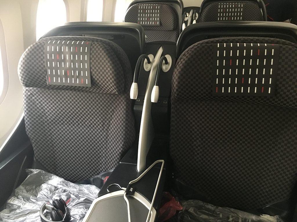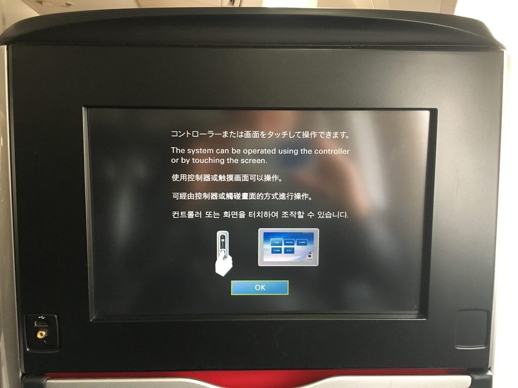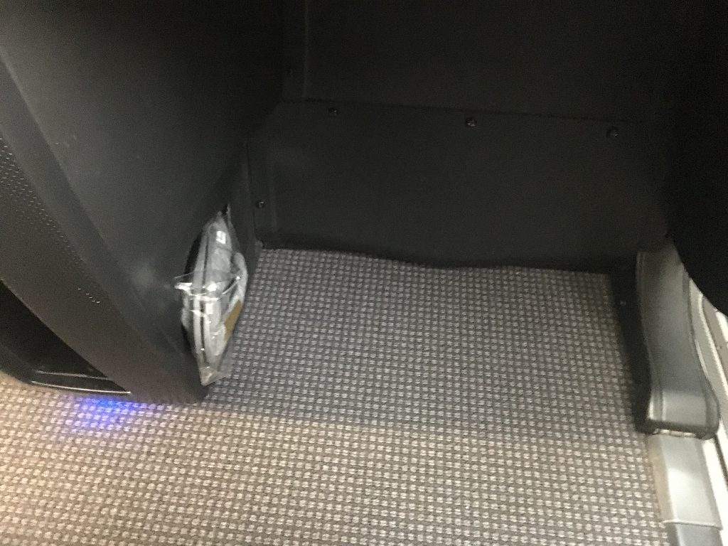 Am Platz lagen dann eine eingeschweißte Decke, eingeschweißte Kopfhörer und ein Bügel mit meiner Platznummer bereit. Ein Amenity Kit gibt es auf dieser Strecke nicht. Im Fußraum lagen noch ein Paar Slipper bereit. Als ich meine Jacke auszog, kam sofort eine Cabin Attendant vorbei, nahm mir Jacke und Bügel ab und übernahm auch das Aufhängen.