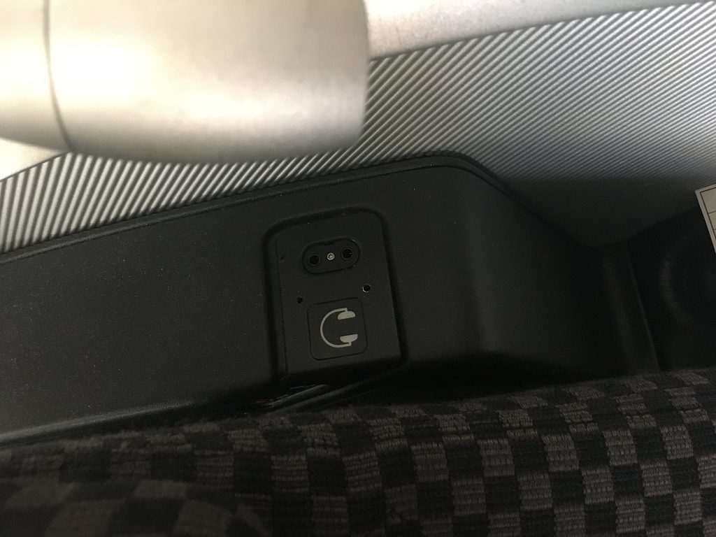 Zwischen den vorderen Sitzen befinden sich ein Zeitschriftenfach, darunter ein Halter für Wasserflaschen, der zum Boardingzeitraum noch nicht bestückt war. Der 15,4 Zoll Bildschirm befindet sich direkt geradeaus, der Blickwinkel lässt sich leicht nach oben/unten verstellen. Leicht versetzt neben dem Bildschirm befindet sich ein USB-Anschluss, mit dem man seine Geräte laden oder auch Fotos auf dem Bildschirm anzeigen lassen kann. Unter dem Bildschirm befindet sich ein Ablagefach.