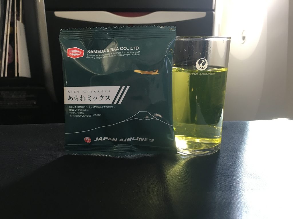 Zur Begrüßung gab es dann noch einen „Sky Time Kiwi“ – ein extra für JAL komponierter „Cocktail“, der sehr unglamourös aus einem Tetrapack eingeschenkt wird und eine Packung mit Reisgebäck und Nüssen.