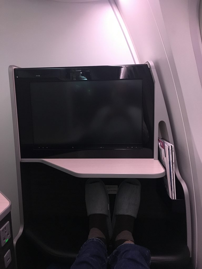 Ich litt an „ReiheEinseritis“ und habe mich für einen Sitzplatz ganz vorne entschieden. Was auf der Bordkarte vielleicht toll aussieht, hatte auf dem Flug leider einen kleinen Nachteil. Die erste Sitzreihe ist so weit vorne, dass die Röhre des Flugzeugs dort schon etwas kleiner wird. Das reduziert den in der „Suite“ zur Verfügung stehenden Platz.