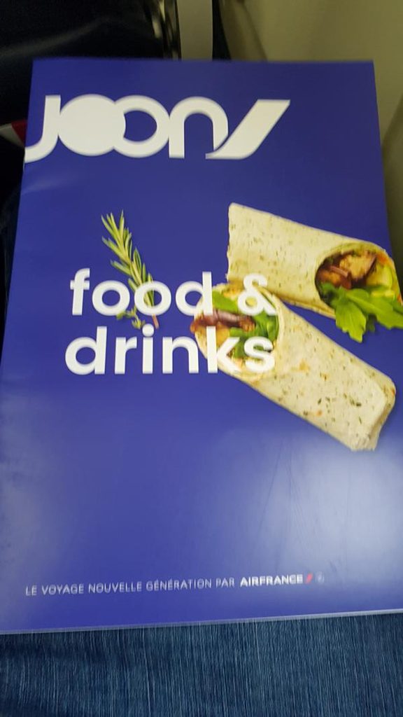 Entgegen zur Mutter Air France gibt es bei JOON keinerlei Snacks auf der Mittelstrecke. Lediglich Orangensaft, stilles Wasser, schwarzer Tee und organischer fair gehandelter Segafredo Kaffee werden gratis gereicht. Für diverse Snack- und Kombiangebote wird auf das in den Sitztaschen ausliegende Menü verwiesen. Hier werden übliche Snacks und Getränke zu flugüblichen Preisen angeboten