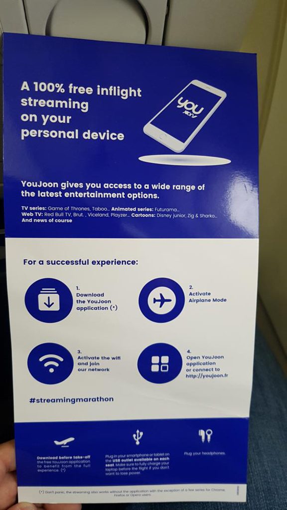 Auffallend ist, dass JOON in der Kabine Wi-Fi anbietet. Dies ist jedoch nicht für die Nutzung des allgemeinen Internets vorgesehen sondern dient vielmehr dazu, die Verbindnung zum Inflight-Entertainmentprogramm herzustellen. Mittels der eigens entwickelten App „YouJoon“ können Filme, Serien, Zeitschriften und Musik auf das eigene mobile Endgerät gestreamt werden. Auch die gängigen Browser Mozilla Firefox, Google Chrome und Opera werden unterstützt.