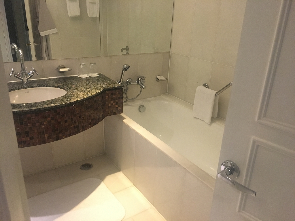 Die Zimmer im JW Marriott Bangkok sind von dunklem Holz dominiert und wirken dadurch etwas klein. Wenn man sich durch Zimmer bewegt merkt man, dass sie es nicht sind, aber der Eindruck hält sich. Die Bäder liegen komplett innen, so dass man hier bei dem schweren Marmor und dem nicht allzu hellen Licht vorkommt, wie in den frühen 90er Jahren. Heutige Zimmerkonzepte geben da deutlich elegantere Lösungen her. Es wirkt alles sehr wertig, aber wirkt irgendwie auch altbacken.