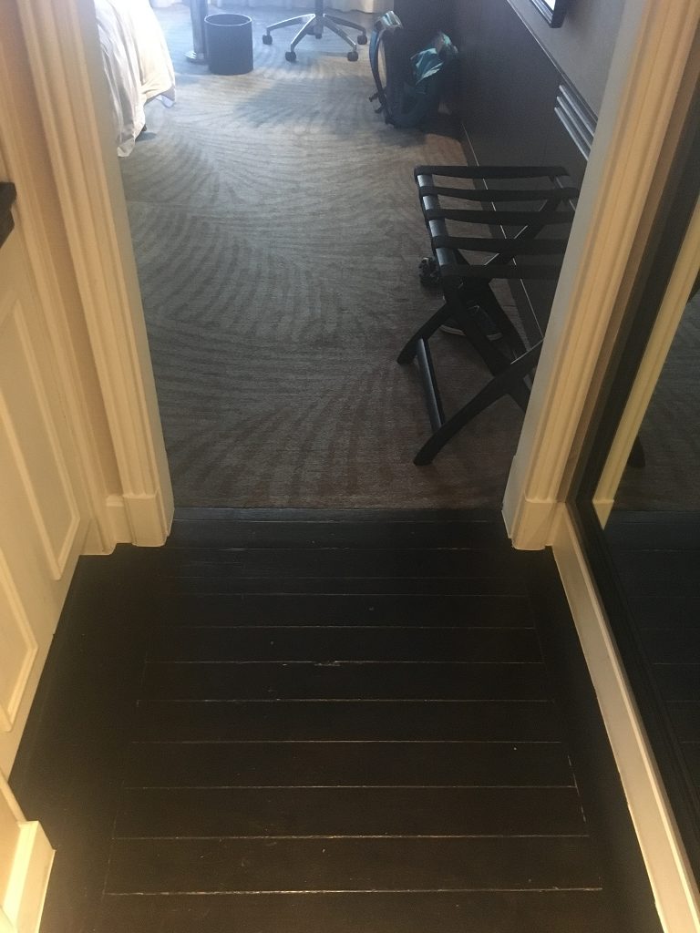 Ein Upgrade auf eine Suite habe ich in diesem Hotel ohne Suite Night Award Einsatz nie bekommen. Man versucht sich mit Upgrades auf Executive King Zimmer aus der Affaire zu stehlen. Bei Aufenthalten von drei Nächten und weniger ist das zwar ein Verstoß gegen die Terms and Conditions von Marriott Bonvoy, aber das scheint das Hotel nicht zu stören. Wie zum Hohn hängt ein großes Poster mit den Elite Benefits an der Tür am Eingang zum Personalraum hinter der Lounge.