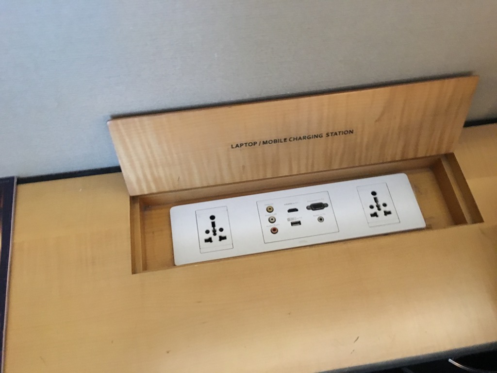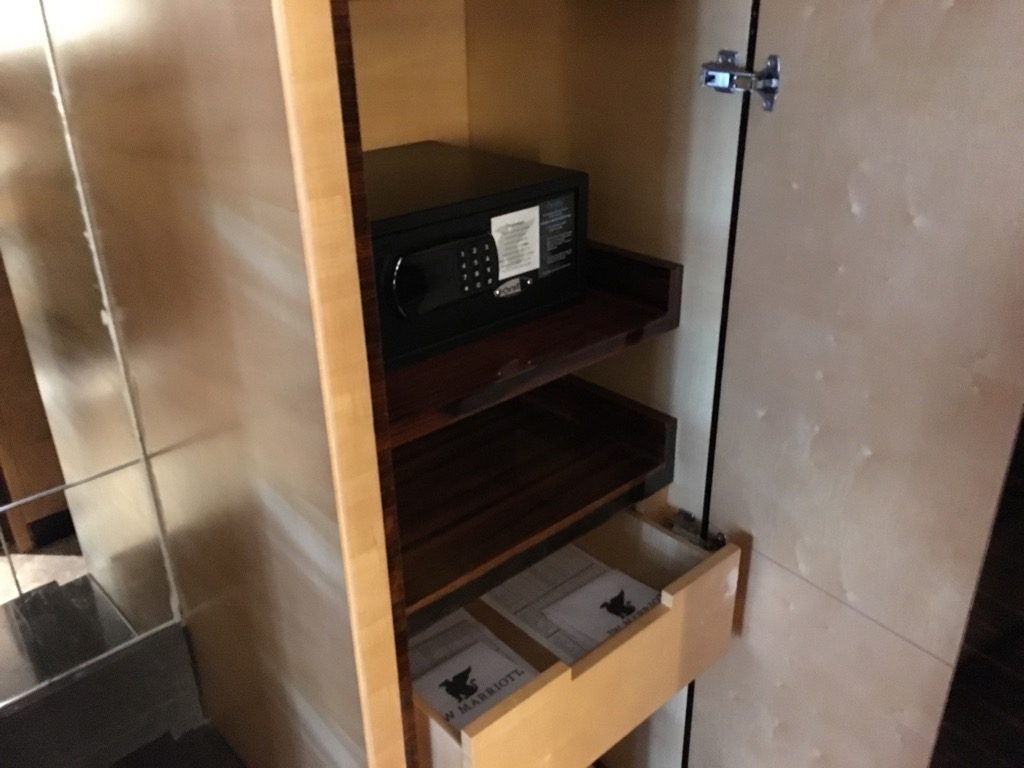 Besonders der Schreibtisch hat mir sehr gut gefallen, da ich im Hotel doch auch einmal ein paar Stunden hier verbringe. Reine Marriott Hotels haben in letzter Zeit angefangen die Schreibtische abzuschaffen. Wie es sich für ein internationales Flughafenhotel gehört, gab es natürlich auch internationale Steckdosen im gesamten Zimmer, sodass ich meine Reiseadapter nicht gebraucht habe.
