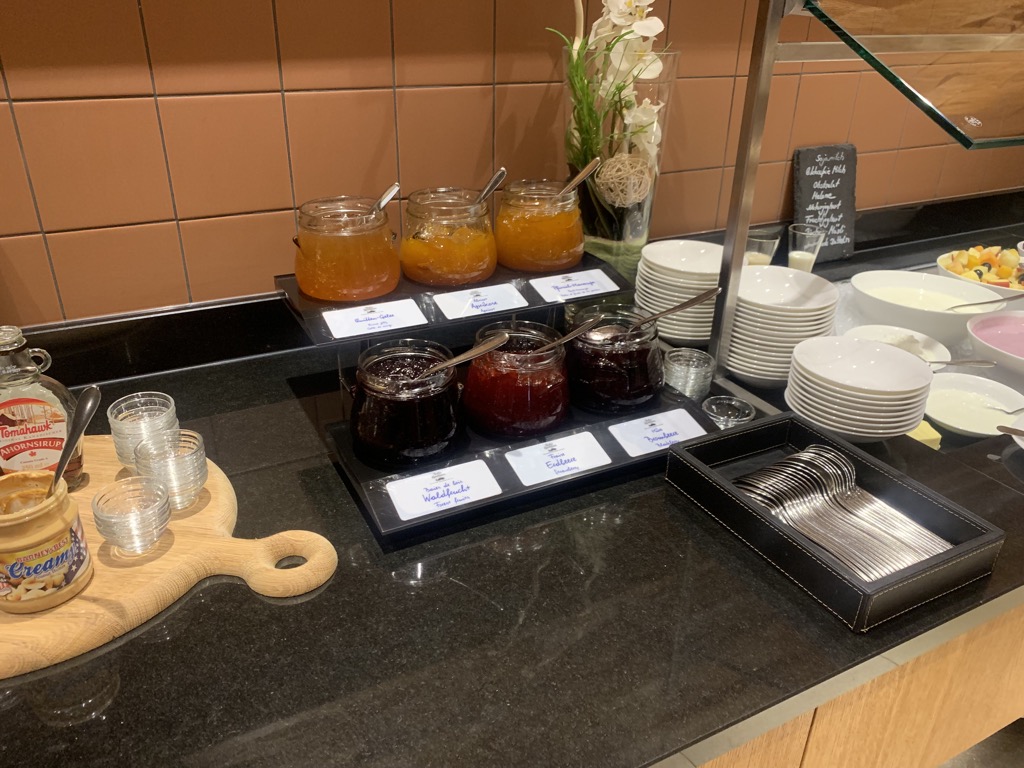 Das Angebot hat keine Wünsche offen gelassen. Neben verschiedenen Sorten Brot und Brötchen gab es Aufschnitt, Müsli, Joghurt, Säfte, Lachs und noch viel mehr. Besonders toll fand ich, dass auf dem Buffet einige pfälzischen Spezialitäten zu finden waren. Insgesamt machte alles einen sehr frischen Eindruck und wurde regelmäßig aufgefüllt
