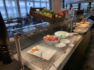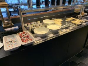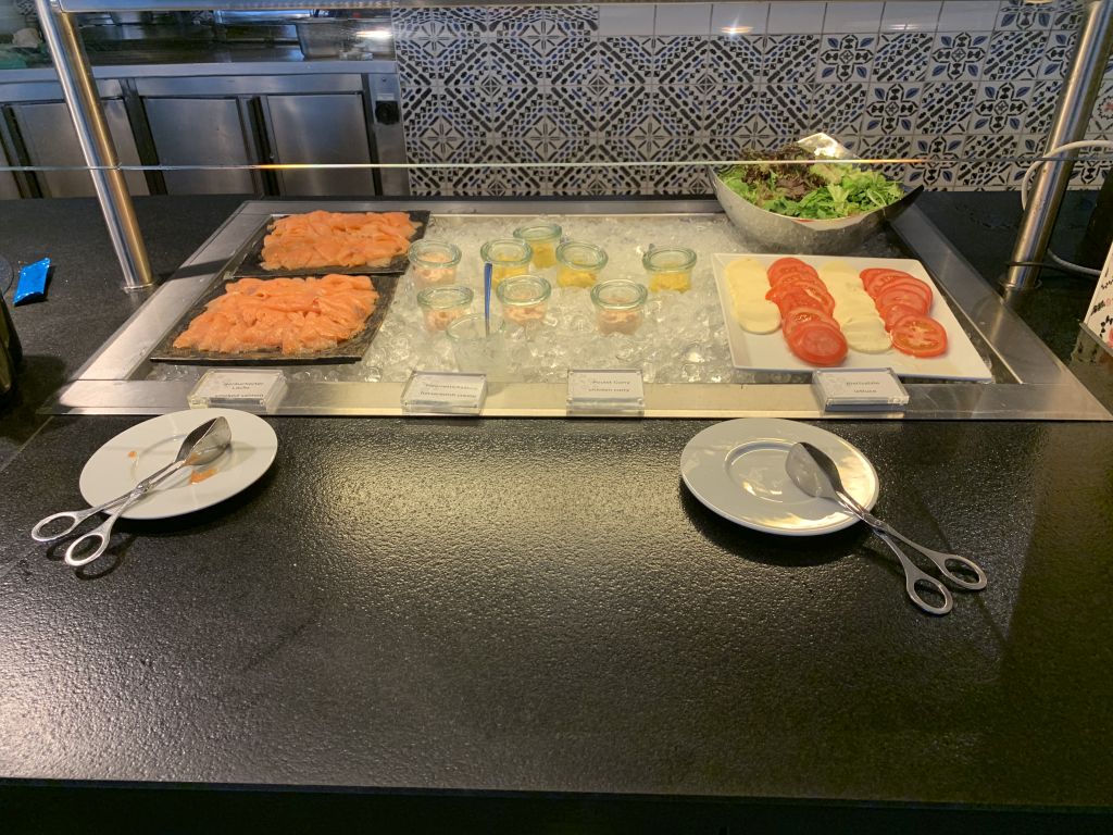 Daneben gab es kalte Platten mit Lachs, Wurst, Obst und verschiedenen Käse-Sorten, sowie eine Auswahl an Marmeladen und Frühstücks-Cerealien.