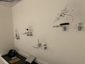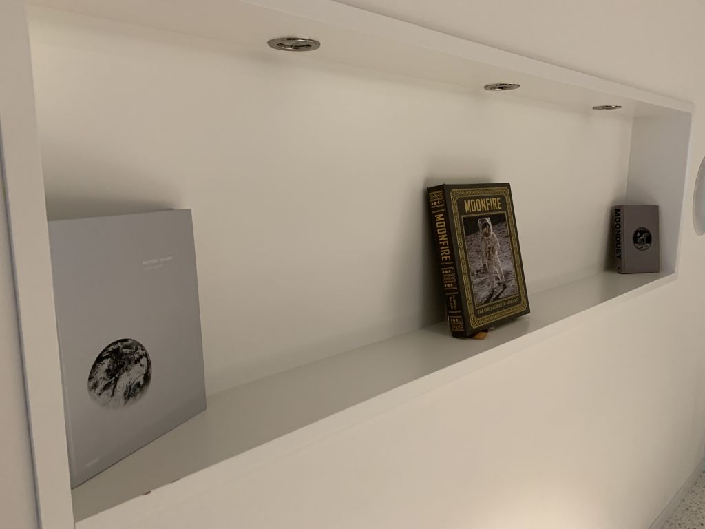 Der Wohnbereich der Suite befindet sich am Ende des Ganges. Dieser wird dem Space-Thema ebenfalls voll gerecht. Spacige Lounge-Möbel, ein aus Sechsecken bestehender silberner Couchtisch, sowie mehrere Raumfahrt-Modelle und die passende Literatur durften nicht fehlen.