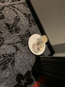 Unsere Suite war die Oriental Suite Zimmer Nummer 146 in der ersten Etage im hinteren Flügel des Hotels. Schon bei der Ankunft an der Tür unseres Zimmers wunderten wir uns, dass noch dreckiges Geschirr vor der Tür stand. Aber das kann ja mal passieren.