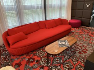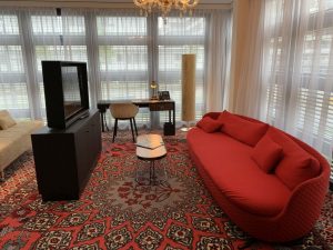 Als wir dann den Wohnbereich mit rotem Sofa, Schreibtisch und frei stehendem Flachbild-Fernseher inspizierten, fiel uns die nächste Überraschung auf. Auf dem Tisch stand ein benutztes Glas. Offensichtlich wurde die Suite nicht vollständig gereinigt.
