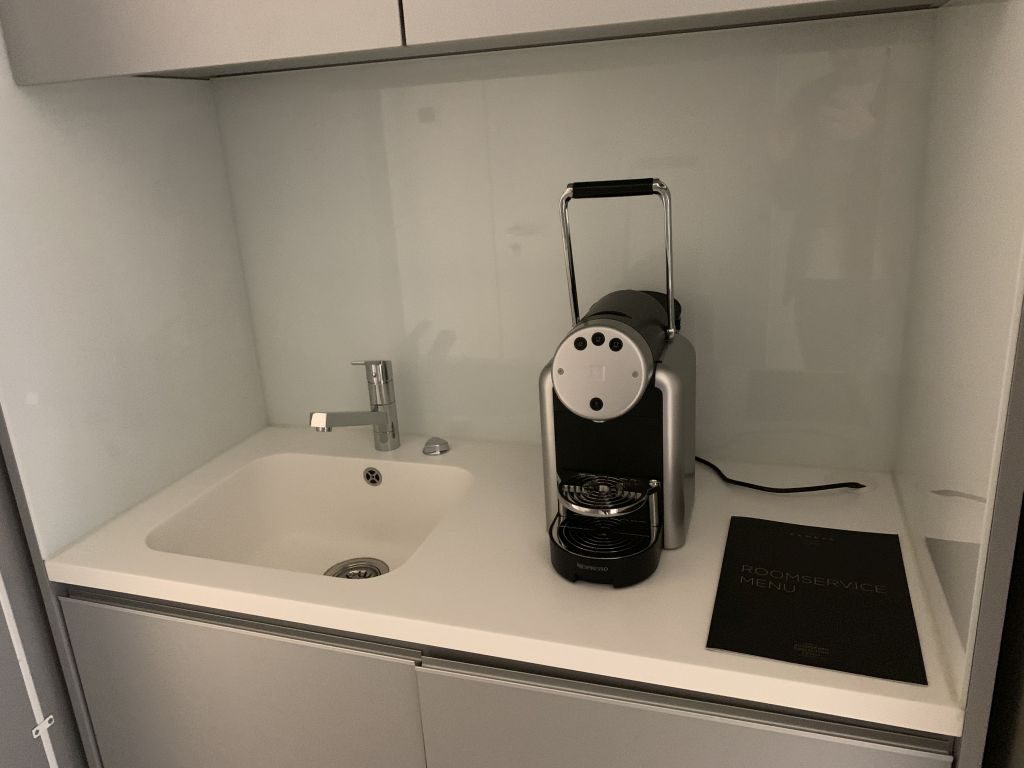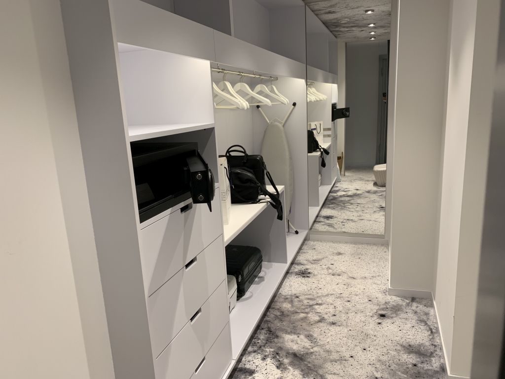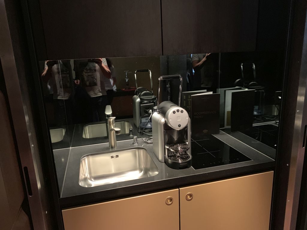 Weiter dem Gang folgend befindet sich der begehbare Kleiderschrank, in dem auch der Tresor steht. Neben dem begehbaren Kleiderschrank findet sich auch in dieser Suite eine kleine Küche mit Coffee-Marker, Kühlschrank und Spüle.
