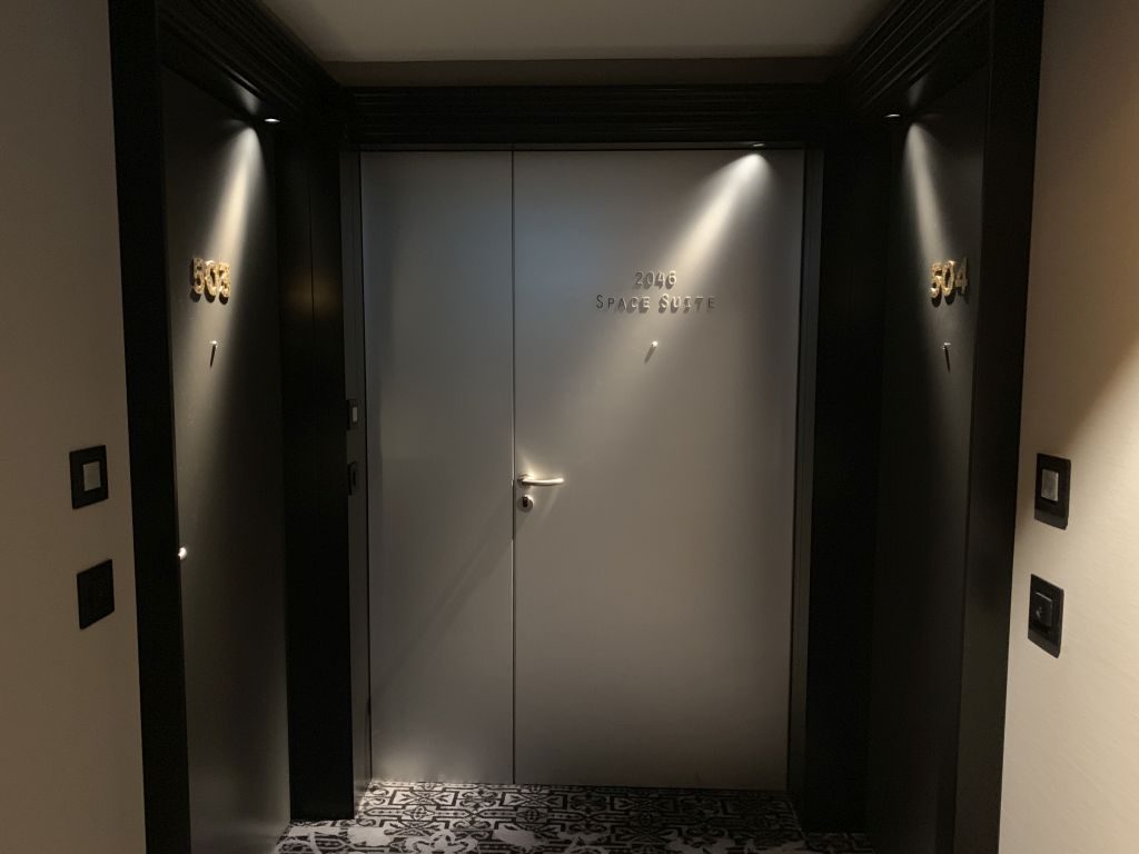 Die Space Suite befindet sich am Ende des Ganges. Durch die Tür gelangt man in einen Flur, der nach links und rechts abgeht. Zu beiden Seiten der Eingangstür findet man Verbindungstüren zu den anliegenden Zimmern 503 und 504.