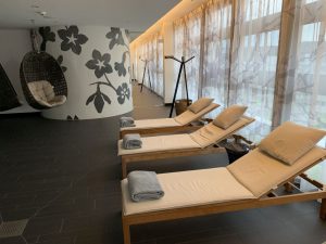 Für die Zeit zwischen den Sauna-Gängen gibt es einige Liegen im Inneren. Alternativ kann man bei gutem Wetter auch auf die große Außenterrasse ausweichen.