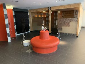 Zu unserer Entspannung stehen eine 60 Grad und eine 90 Grad Sauna bereit. Beide ermöglichen durch die Glasfront Einblick in den Sauna-Bereich und Richtung Fenster. Zusätzlich gibt es noch ein Dampfbad, drei Duschen und mehrere Becken für ein Fußbad.