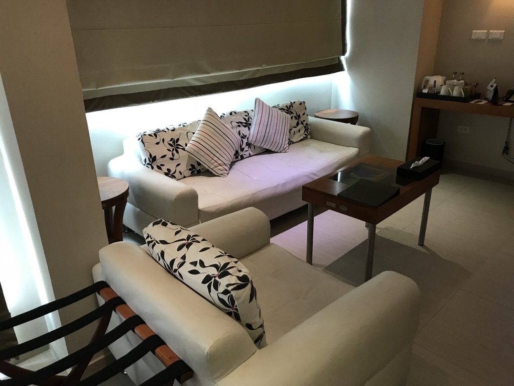 Der Angestellte lief mit uns zu unserem Zimmer und wir fanden das Cleaning-Team vor, die gerade angefangen hatten das Zimmer zu reinigen. Wir sollten auf einer Couch kurz warten und nach wenigen Telefonaten mit der Rezeption wurde uns das Zimmer neben dem eigentlich geplanten gegeben.
