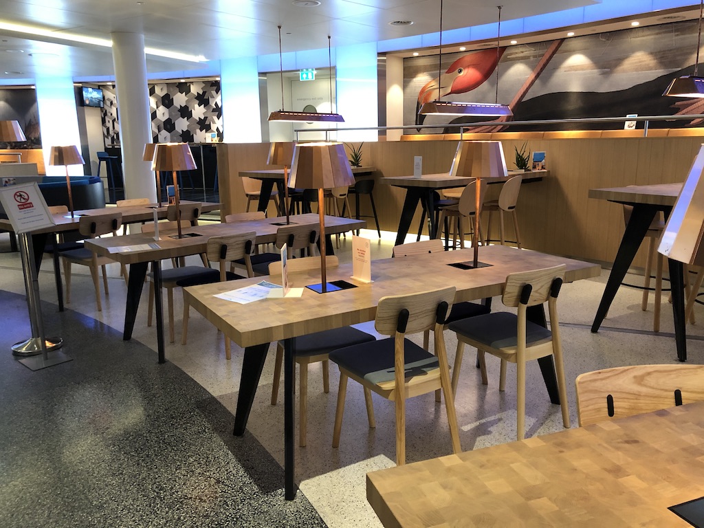 Es war noch Frühstückszeit, neben dem üblichen kontinentalen Angebot wurden auch warme Speisen serviert. Diese wurden von Mitarbeitern portioniert und ausgegeben. Einige Bereiche mit Buffetflächen und Kaffeemaschinen wurden durch das geringe Passagieraufkommen nicht verwendet.
