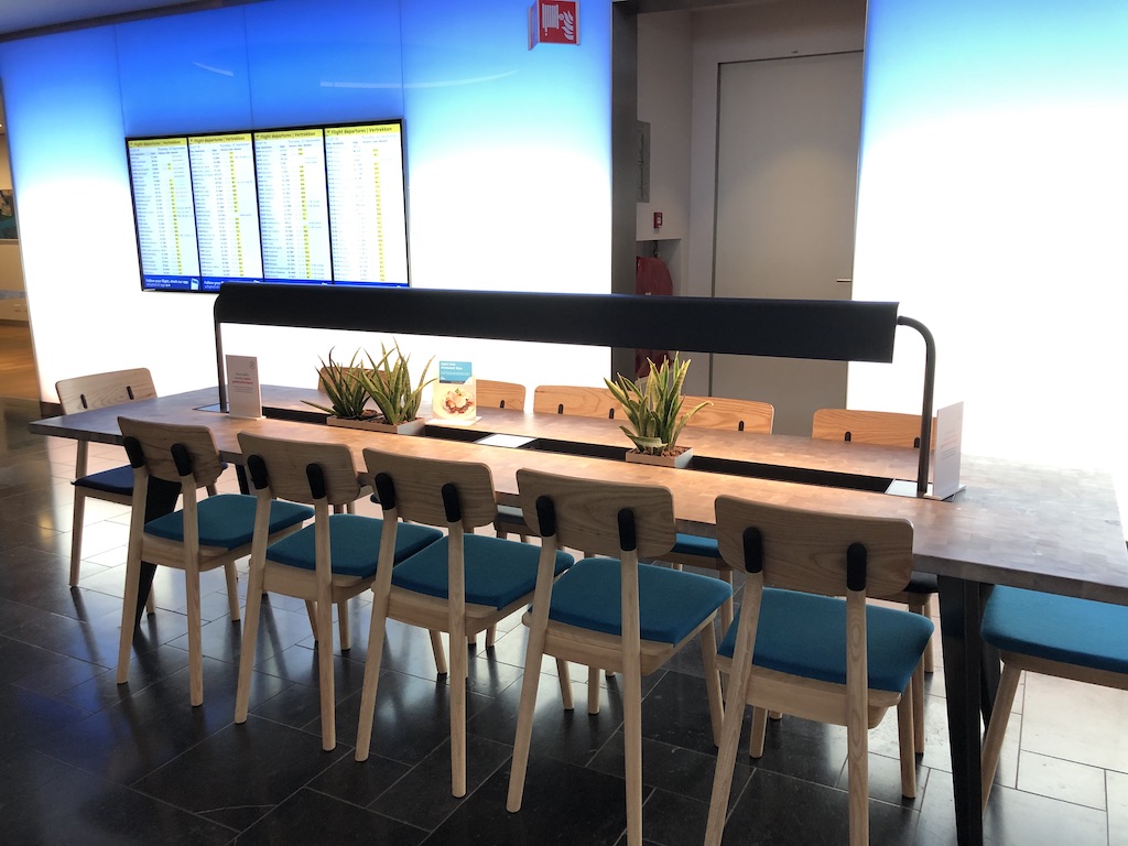 Man findet überall Steckdosen und Lademöglichkeiten sowie schnelles Wifi. Mehrere Servicepunkte sind zur Unterstützung bei Umbuchungen oder Unregelmäßigkeiten der Reise mit Mitarbeiter besetzt.