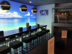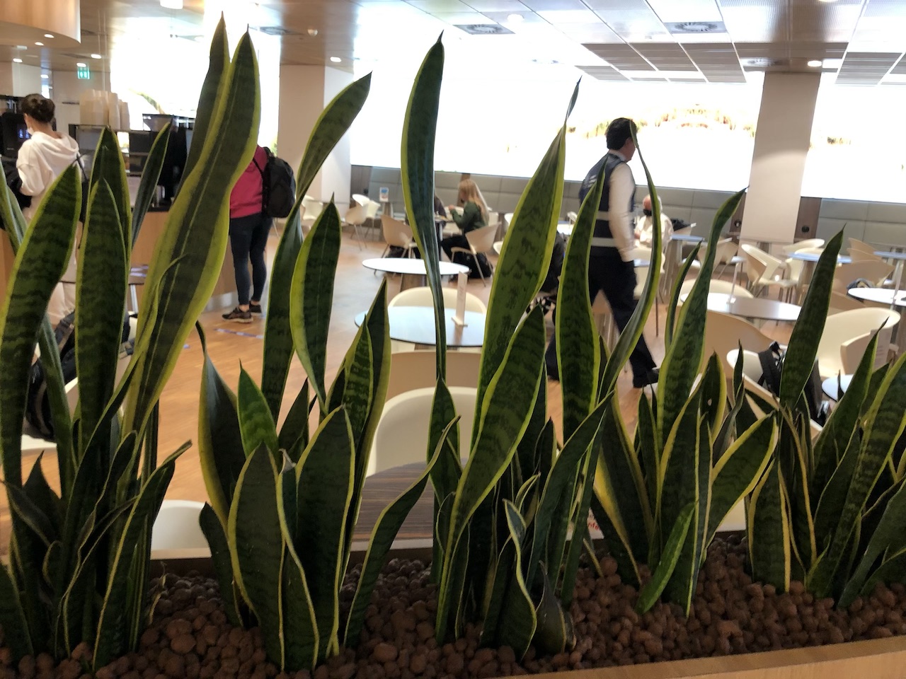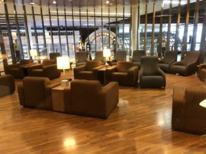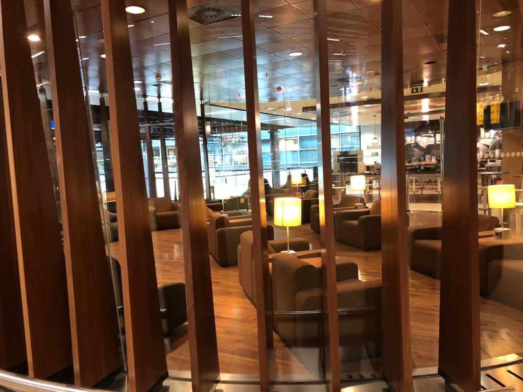 Die Lounge ist hell und freundlich eingerichtet, es gibt viel indirekte Beleuchtung aber kaum Tageslicht. Riesige Panoramafenster erlauben einen Blick aus dem Terminal auf des Geschehen in der Lounge. Die Gates befinden sich aber eine Etage tiefer.
