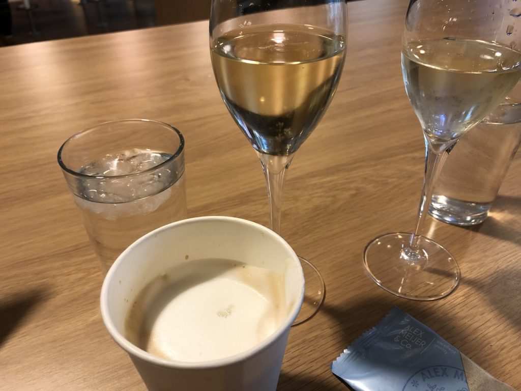 Getränke kann man sich selbst holen, der Kaffee aus dem Automaten war akzeptabel. Der Cappuccino hatte sogar einen besonders cremigen Milchschaum. Für Heißgetränke gab es lediglich Pappbecher, für Espresso standen kleine Tassen bereit. Insgesamt drei dieser Kaffeestationen habe ich gezählt, es gab kaum Gedränge. Dort findet man jeweils auch Tee, Milch, Zucker und Gebäck.