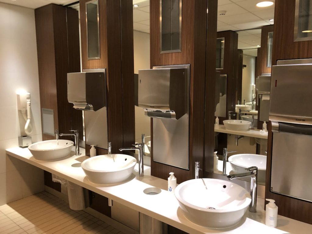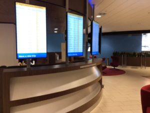 Im Eingangsbereich gibt es auch einige Serviceplätze an denen Mitarbeiter für Fragen zur Verfügung stehen. Dort werden auch Umbuchungen und weitere Leistungen rund um die Flugreise durchgeführt. Die Waschräume waren sauber, zu normalen Zeiten gibt es auch Duschen.
