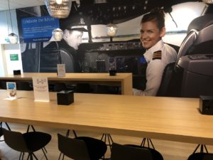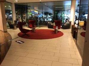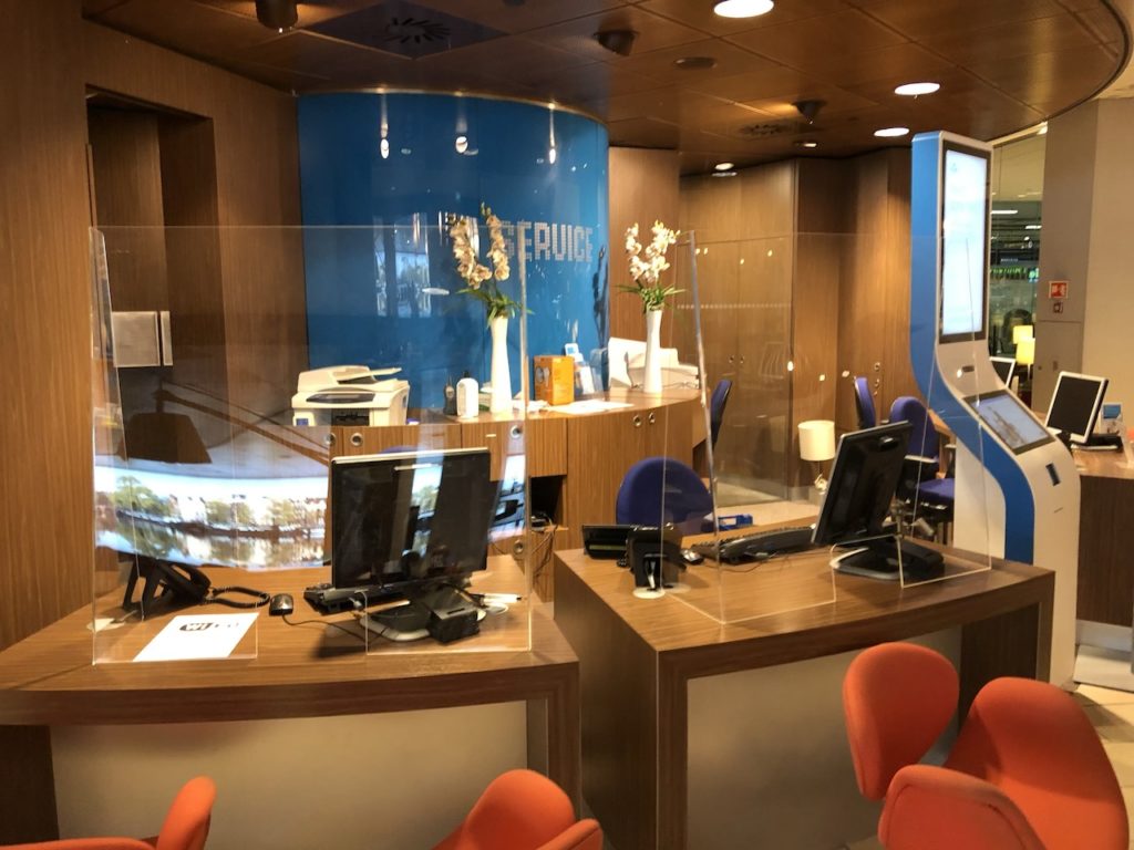 Zum Eintritt der Lounge scannt man die Bordkarte selbst, man kann bei Problemen auch zu den Angestellten am Empfang. Beim Betreten der Räumlichkeit haben zwei uniformierte KLM-Mitarbeiterinnen die Besucher auf die Maßnahmen zur Distanzierung und Einhaltung der Wege aufmerksam gemacht.