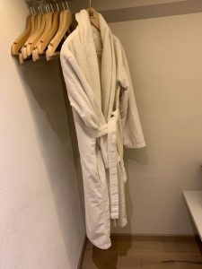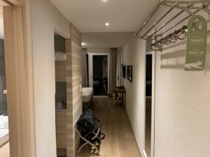 Bei der Anreise am Donnerstagmorgen ließ ich zunächst meine Tasche im Auto und wartete in der Lobby auf die restlichen Kollegen. Erst nach dem Ende des ersten Tages unserer Veranstaltung ging ich zur Rezeption, um meine Zimmerschlüssel zu erhalten. Alles war schon vorbereitet und so musste ich lediglich meine Schlüsselkarte für das Zimmer im Spa-Gebäude entgegen nehmen. Da das Zeitfenster bis zum Abendessen knapp war, war ich dankbar für die schnelle Abwicklung.