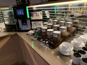 Eine Kaffeespezialität kann man sich selbst an einem Vollautomaten zubereiten. Zusätzlich gibt es diverse Milch, Smoothies, Wasser und diverse Säfte der nahe gelegenen Saftfabrik „Van Nahmen“. Wer schon am Morgen einem Gläschen Alkohol nicht abgeneigt ist, kann sich entweder für Sekt oder einen Frucht-Secco entscheiden.