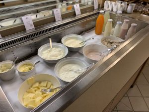 Wer nicht zum Brot oder Brötchen greifen will, kann sich aus einer Auswahl an Müslis und Joghurt bedienen. Und auch Salat ist vorhanden. Eierspeisen, wie Omelettes, werden auf Wunsch an einer Live-Cooking-Station zubereitet. Für den süßen Zahn gab es Kuchen und weiteres Süßgebäck.